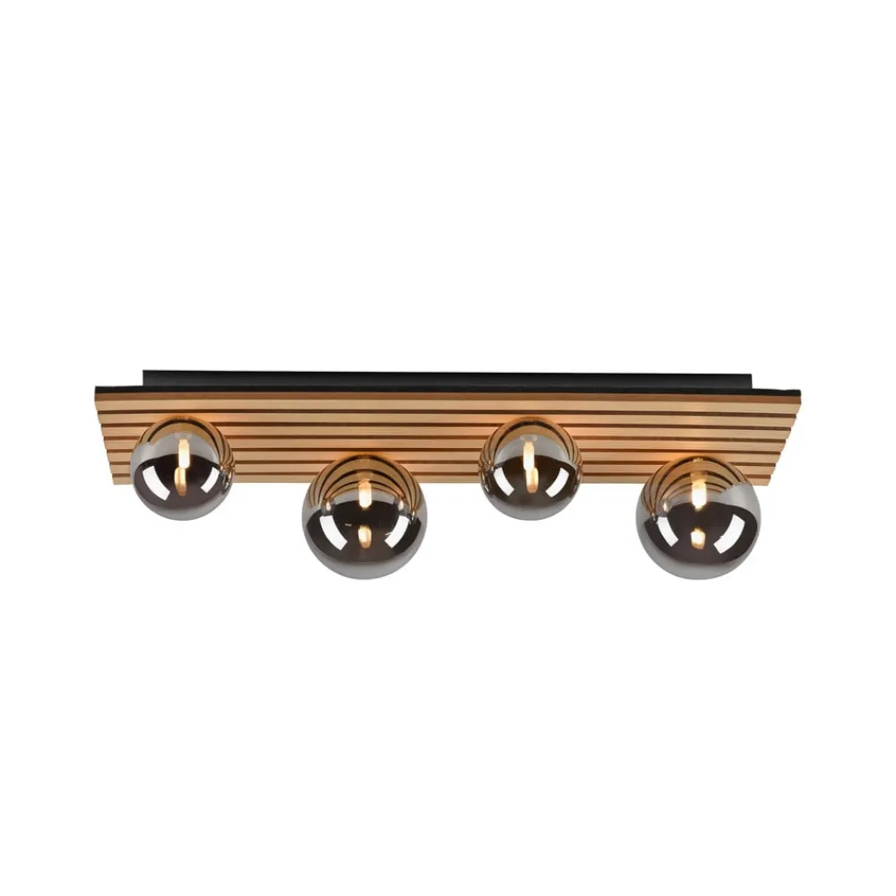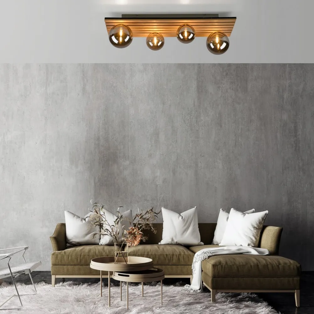 Rektangulær Green Stika loftlampe med træbeklædning og sfæriske skærme Green Stika er en rektangulær loftlampe udstyret med individuelle lange træstivere. Fire sfæriske skærme af røggråt tonet glas – to store og to mindre – er fordelt langs den lange baldakin af træ, så pærerne indeni (G9 max 5 W – medfølger ikke) kan afgive en varm og meget behagelig belysning. Armaturerne i Green-serien har et særligt fokus på brugen af bæredygtige eller genbrugte og genanvendelige materialer for at minimere CO2-fodaftrykket. Unge og dynamiske værdier kendetegner JUST LIGHT-mærket. – tidligere kendt som Leuchten Direkt