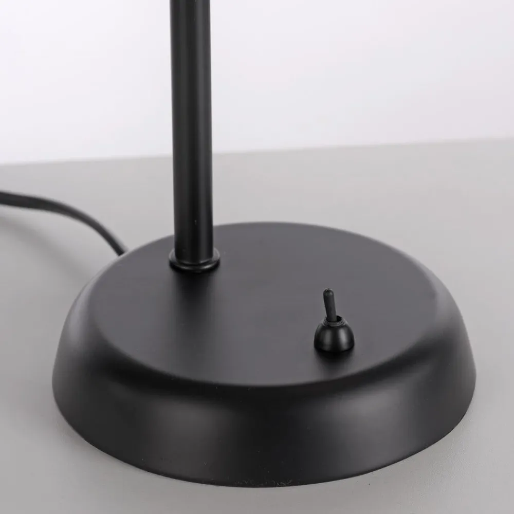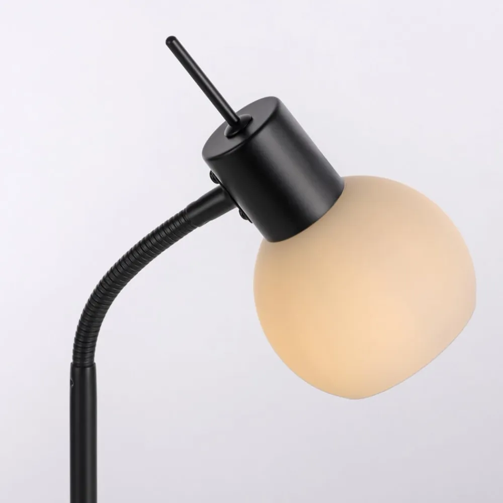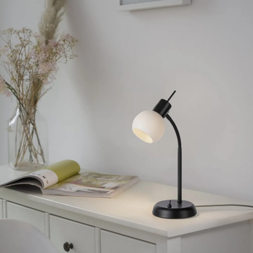 Loki bordlampe af jern og glas med LED-pære E14 Loki er en bordlampe med et stel af sortlakeret jern og en næsten sfærisk skærm af glas. Den er en allrounder til mange områder, hvad enten det er som læselampe i stuen, som lyskilde på skrivebordet eller som natbordslampe. Lampehovedet kan orienteres efter behov takket være det fleksible område på stellet. Bordlampen med en næsten sfærisk, satineret skærm leveres med en LED-pære med E14-sokkel og varmhvid lysfarve og er udstyret med en afbryder på soklen.