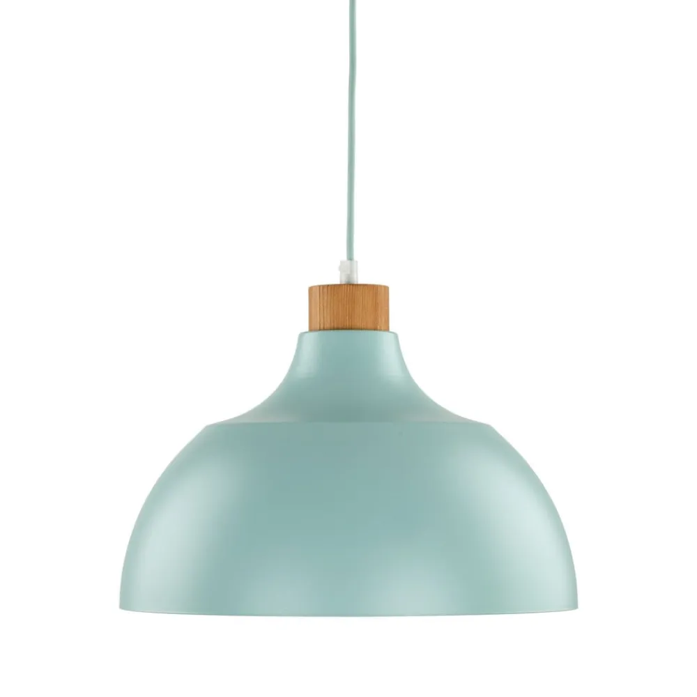 1-lysskilte pendellampe Kaitt med rund stålskærm i mintgrøn og lyse trædetaljer