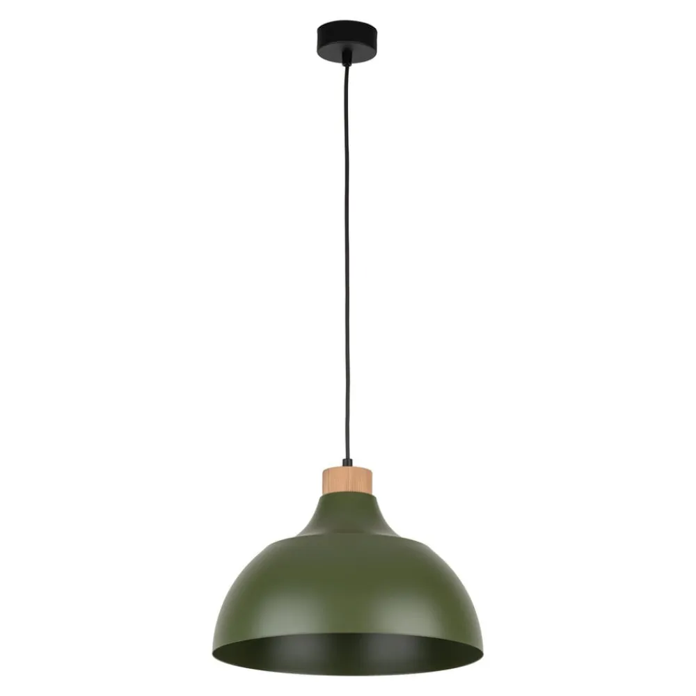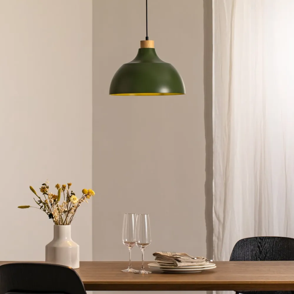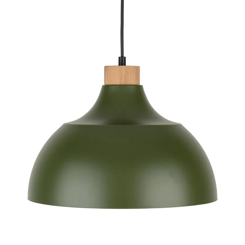 1 lyskilde pendellampe Kaitt med rund stålskærm i grøn og lyse trædetaljer