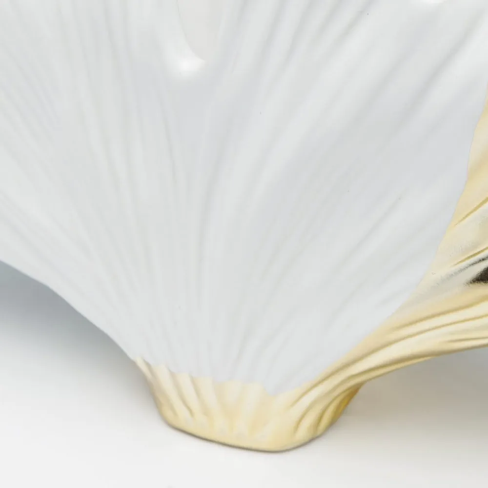 Ginkgo Elegance-vase af glaseret stentøj Denne kunstneriske keramikvase i den unikke form af et ginkgoblad er et særligt blikfang. Den hvide keramik i den glaserede vase fremhæves af guldfarvede detaljer, som giver den et elegant og luksuriøst udseende og gør den til et sofistikeret blikfang. Vasen er fremstillet af glaseret stentøj, der er brændt ved en temperatur på 1200 °C.
