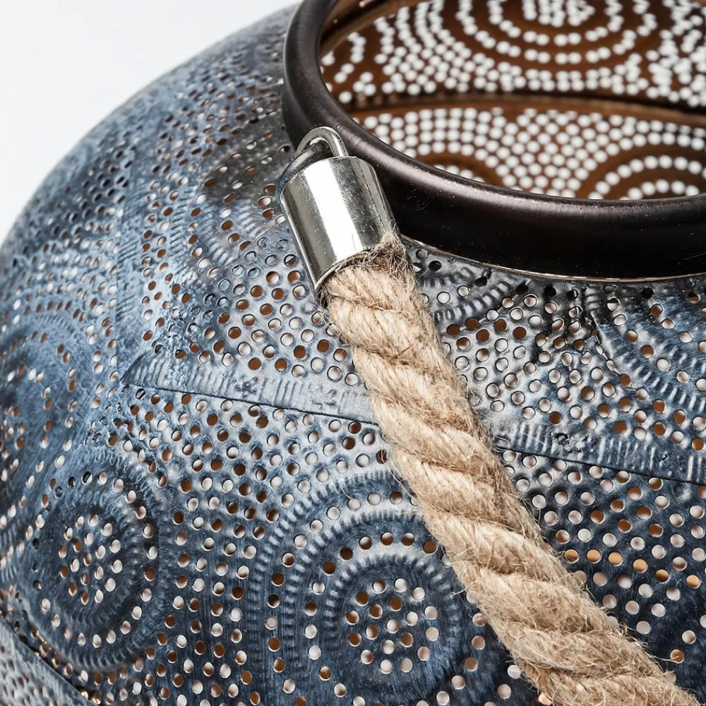 Detaljeret Sultan-gulvlampe i form af en vase Sultan-gulvlampen har et særligt orientalsk look med et fortryllende ornamentalt mønster, der pryder metalskærmen. Mønsteret er ikke bare malet på eller præget ind i skærmen, men er et fint perforeret mønster, der ikke kun er meget effektfuldt i forhold til det generelle udseende, men også bidrager til en meget stemningsfuld lyseffekt. Når den indvendige lyskilde tændes, opstår der et betagende spil af lys og skygge, og mønsteret, som tidligere kun sås på lampekroppen, ser ud til at fylde armaturets omgivelser helt ud. Sultan, som mere end tydeligt minder om en vase, kan smukt bruges som gulvlampe, fordi den passer så harmonisk ind i rummet, men den kan selvfølgelig også placeres på en hævet overflade som et lille sidebord eller en stilfuld kommode.