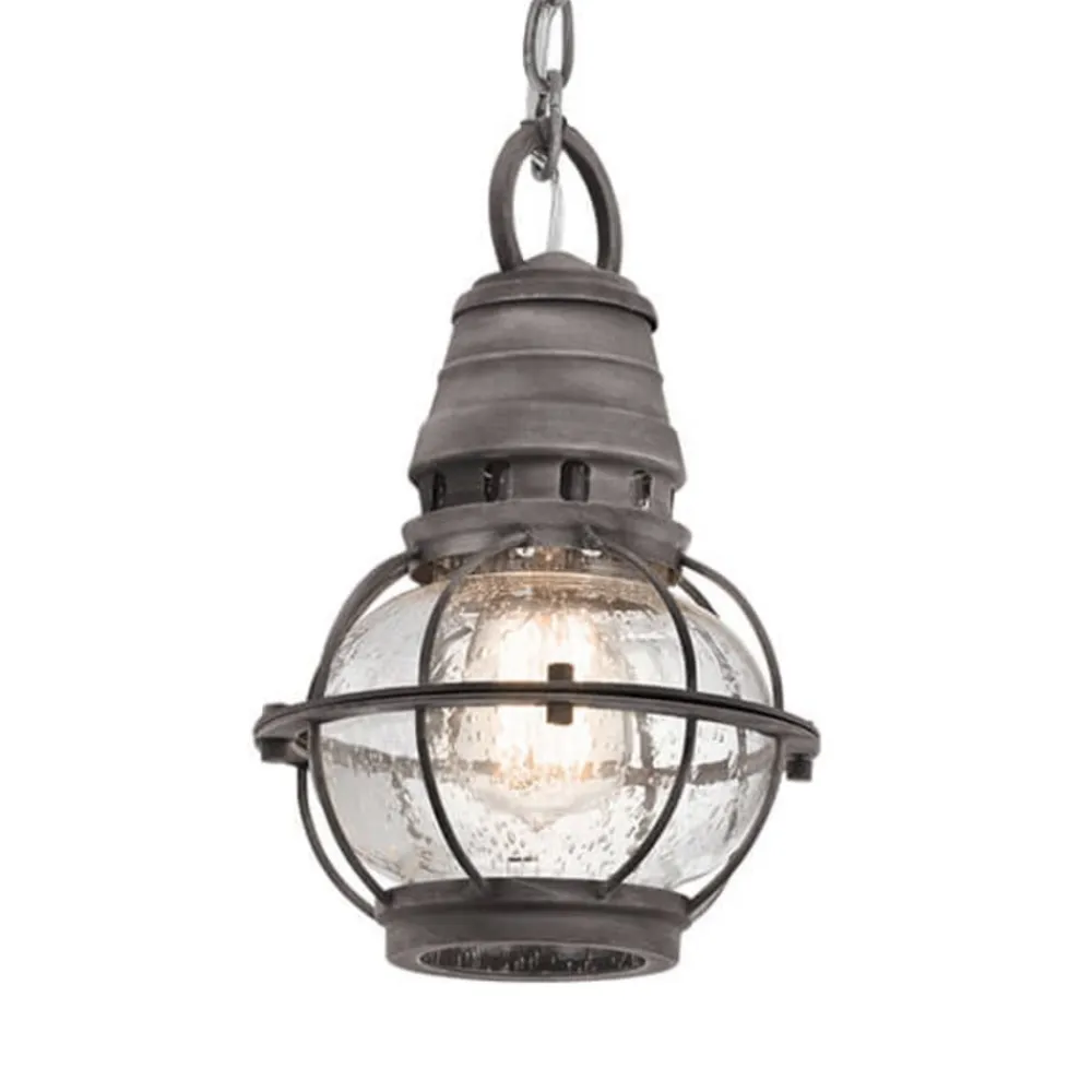 Designmodellerne til det smukke Bridge Point udendørs pendellampe med det pæreformede glas var de traditionelle forsendelses- og jernbanelys.