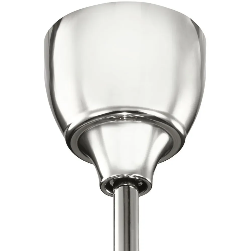 Den tofløjede loftventilator Link virker med sine to vinger af ABS-plast, der udgår fra en stålring, som om den er støbt i ét stykke. Den optiske kontrast mellem poleret nikkel og mørk valnøddetone er også særligt dekorativ. Der medfølger en fjernbetjening.