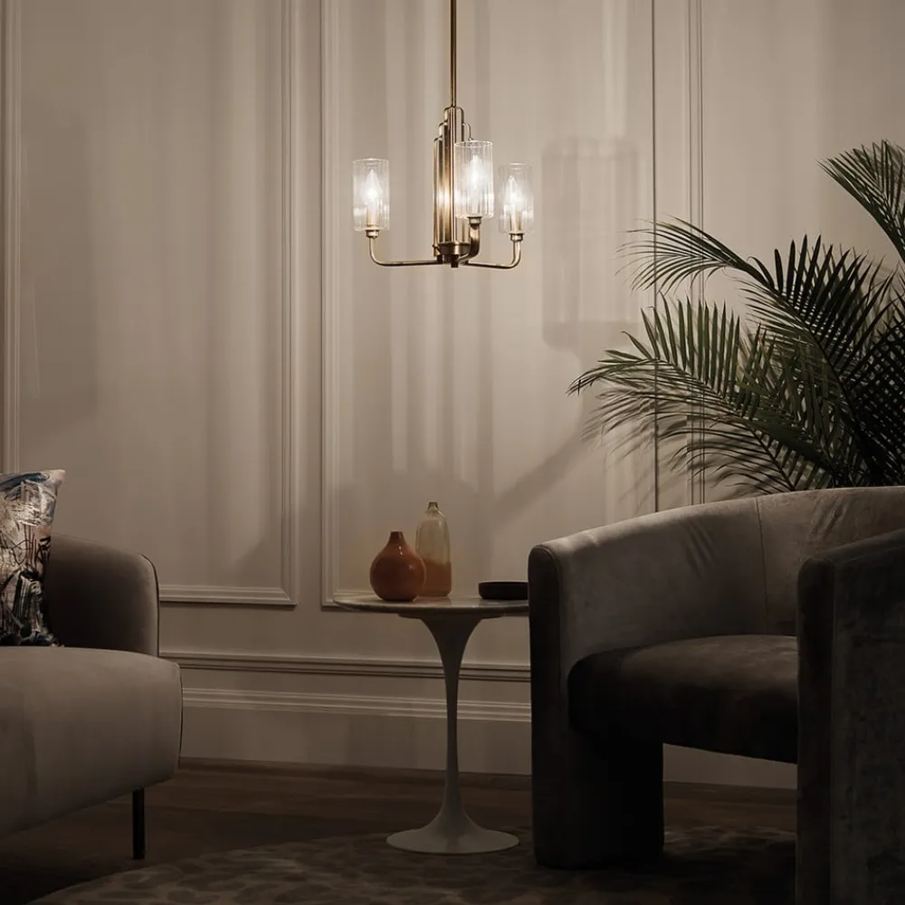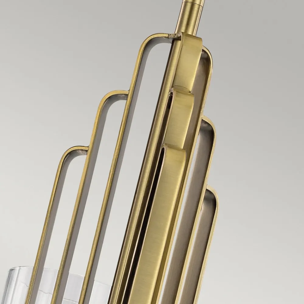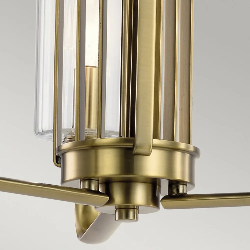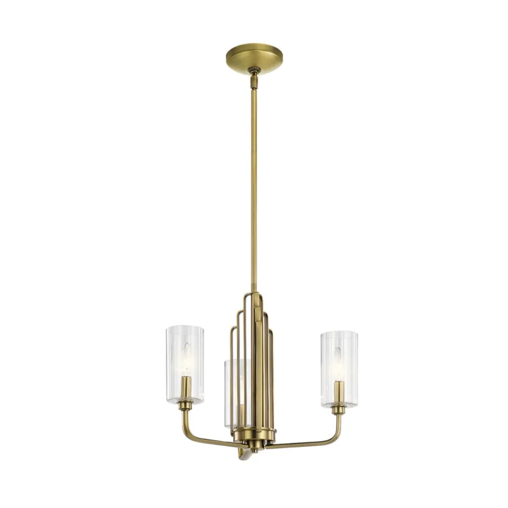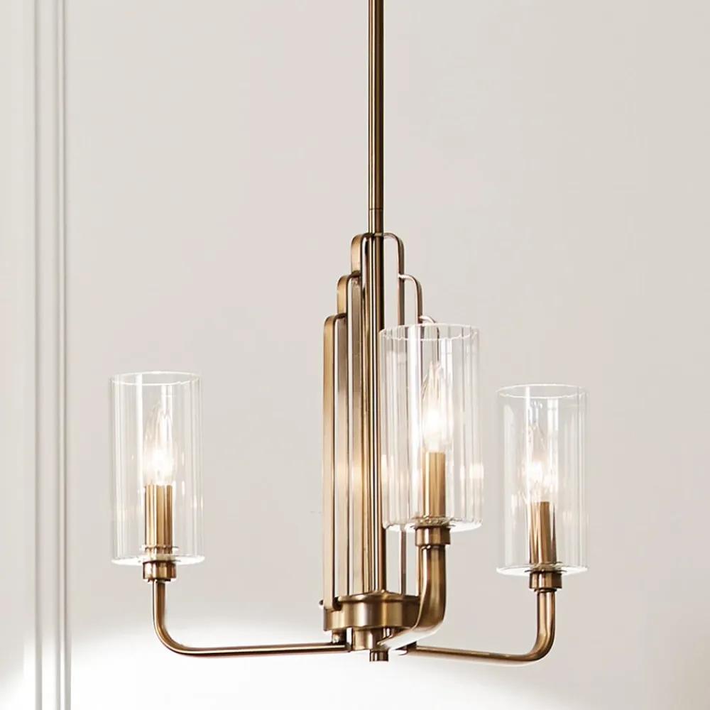 Pendellampe med tre lamper Kimrose i geometrisk form Pendellampen med tre lamper Kimrose er det perfekte valg til alle, der er på udkig efter en stilfuld belysningsløsning. Stellet af børstet stål i ædel messing og de klare, riflede glasskærme samt den geometriske form giver lampen et strejf af art deco-stil og gør den til et ægte blikfang. Særligt imponerende er den smukke lyseffekt, der skabes af de riflede glasskærme, som skaber en hyggelig atmosfære. Skærmene kan tages af. Lampen kan dæmpes udefra og giver dermed maksimal fleksibilitet i belysningen. Uanset om det er over spisebordet eller i stuen – Kimrose-pendellampen med tre lamper er en stilfuld tilføjelse til ethvert hjem.