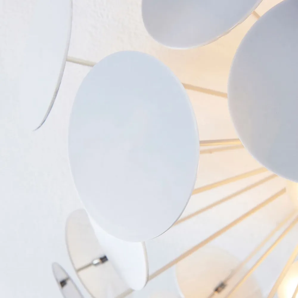 Elegant Kinan loftlampe med hvide plastskiver i en rund form I stedet for en typisk lampeskærm er mange rundformede skiver sat sammen til en slags halvkugle. Disse skiver er hvide på ydersiden og forkromede på indersiden, hvilket skaber smukke spejleffekter. På grund af dette design er lyset præget af lys- og skyggeeffekter, der kan ses i nogle dele af rummet og gør belysningen til noget spændende med en legende karakter. Visuelt gør dette loftlampen særligt velegnet til boligstile, der er lidt mere ungdommelige og præget af en vis munterhed.