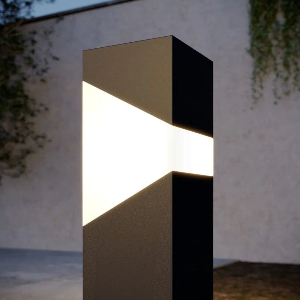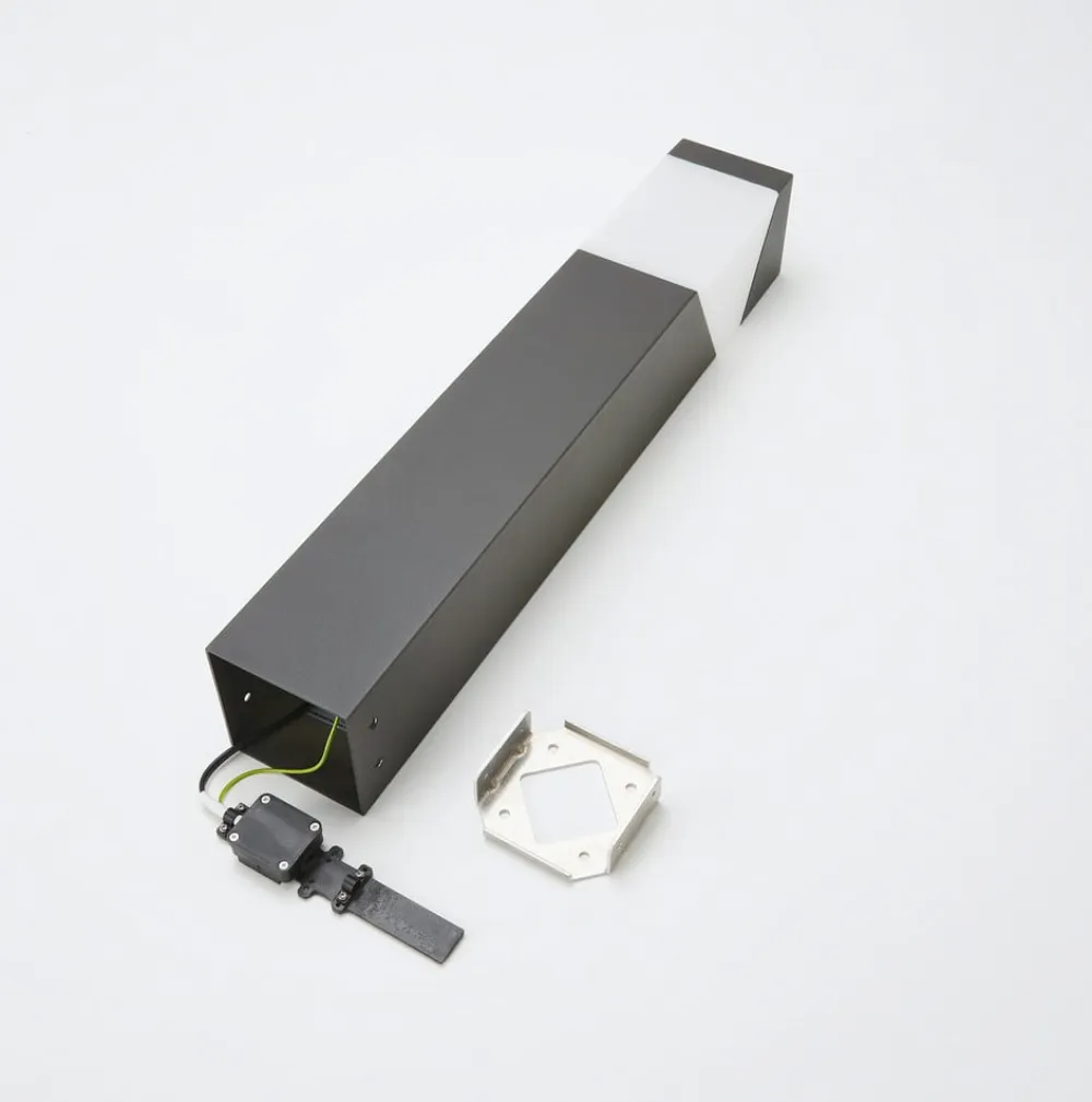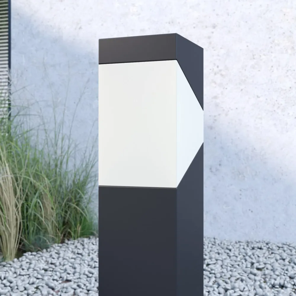 Kiran sokkellampe i grafitgrå Kiran sokkellampen har et moderigtigt design med et moderne look, der samtidig er diskret. Lampekroppen, som går over i lampeskærmen øverst, har en gennemgående kubusform. Rammen er malet grafitgrå, og skærmen er opalhvid. Afskærmningen er lavet af plast, som er mere slagfast end glas, hvilket bestemt ikke er en ulempe i udendørs områder.