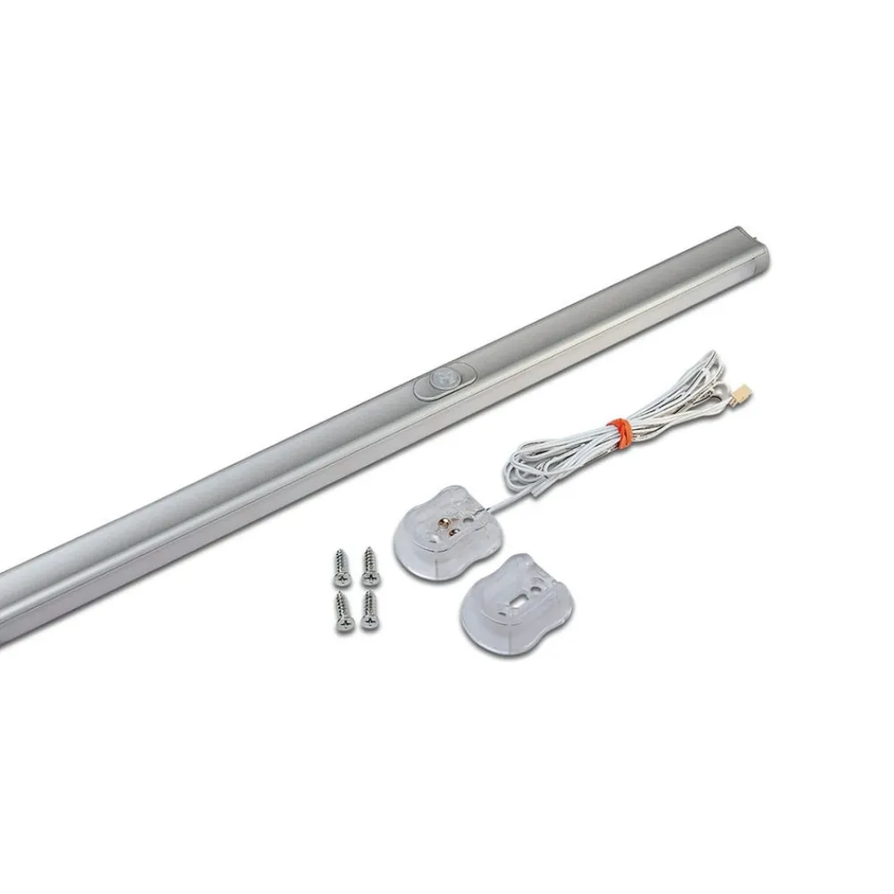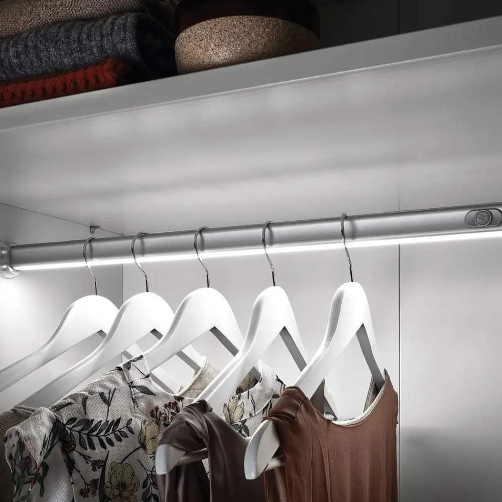 LED-tøjstangslys med integreret bevægelsesdetektor Slut med mørke i klædeskabet – tøjstangen med hvide universal-LED’er oplyser automatisk klædeskabet indvendigt, da der er indbygget en bevægelsesdetektor i stangen. Så snart garderobedøren åbnes, tændes lyset og giver et overblik over garderoben. Stangen kan afkortes individuelt på den ene side – Integreret bevægelsesdetektor med 30 sekunders efterløbstid – Armaturet kan ikke afkortes på strømindgangssiden – Der kræves en DC 24V LED-transformer til tilslutning (se tilbehør) – Leveres med beslag til isætning, fastgørelsesmaterialer og 2,5 m tilslutningskabel til LED 24-transformator