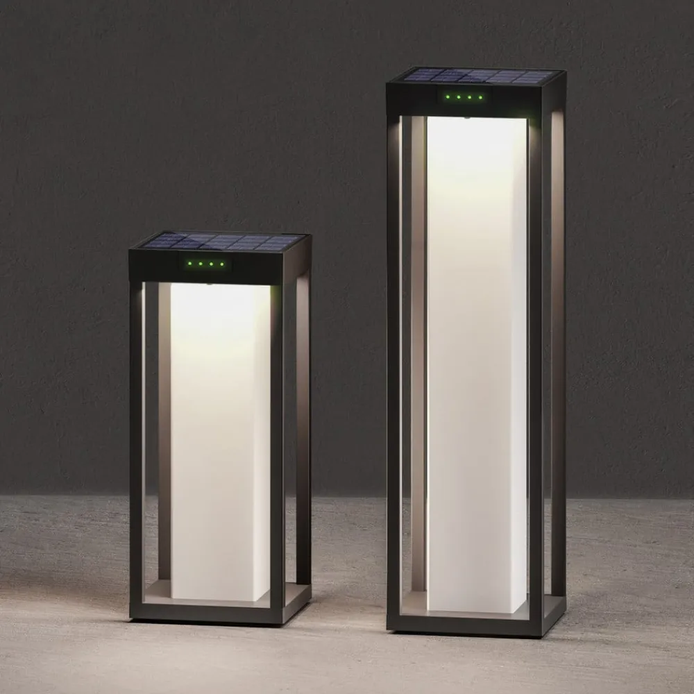 RADIA MINI MOON LED-solcellelampe i en moderne lanterneform til terrasser og haver RADIA MINI MOON LED-solcellelampen giver attraktive lysaccenter til dit udendørs område – hvad enten det er som terrasselampe eller havelampe. Den er lavet af antracit aluminium i en kantet lanterneform og udsender varmhvidt lys gennem en hvid diffusor. Takket være solpanelet, det genopladelige batteri og skumringssensoren er driften helt autonom – Dagslyssensor til automatisk tænding og slukning ved 50 lux – UV-bestandig pulverlakering – Skruer i rustfrit stål – Opladningstid: 6 – 8 timer – Driftstid: 16 – 18 timer – Udskifteligt genopladeligt batteri – Indikator for opladningsniveau – Solpanel: 2,5 W monokrystallinsk, dæksel af hærdet glas