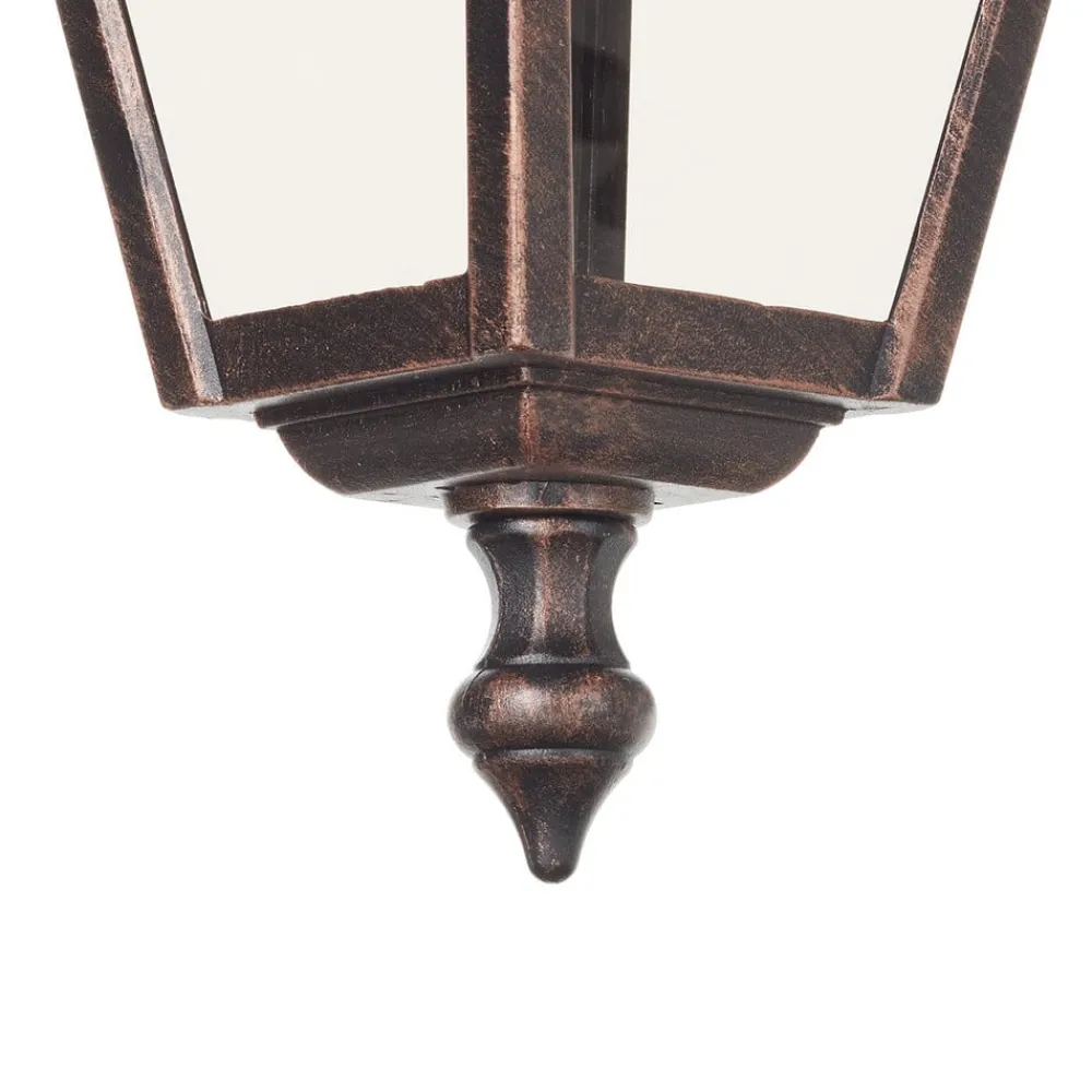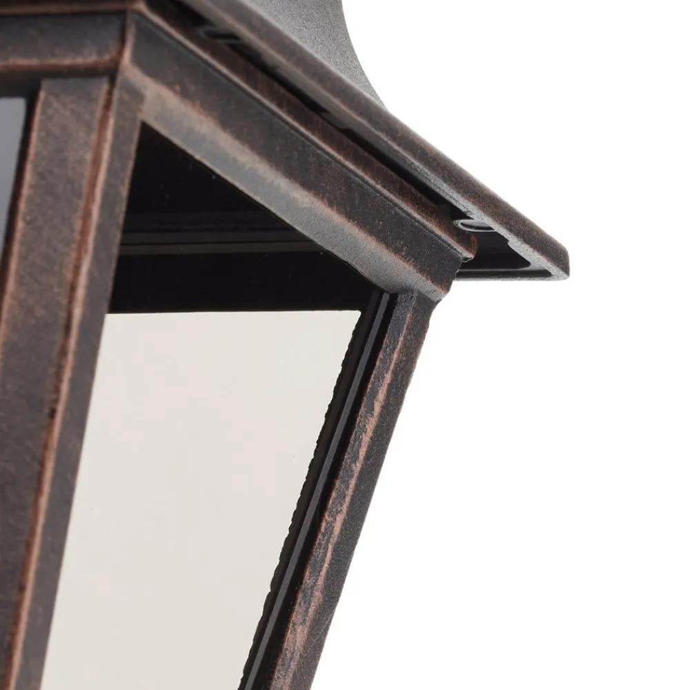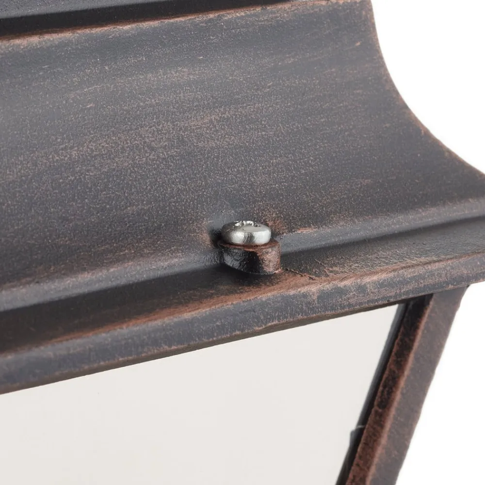 Klassisk udendørs væglampe Toulouse Den udendørs væglampe Toulouse, som er formet som en antik lanterne af kobberfarvet pulverlakeret aluminium og let tonet glas, og som hænger nedad, ser særlig smuk ud på gamle bygninger eller bygninger i rustikt design. Det let tonede, men klare glas oplyser omgivelserne klart og sikkert.