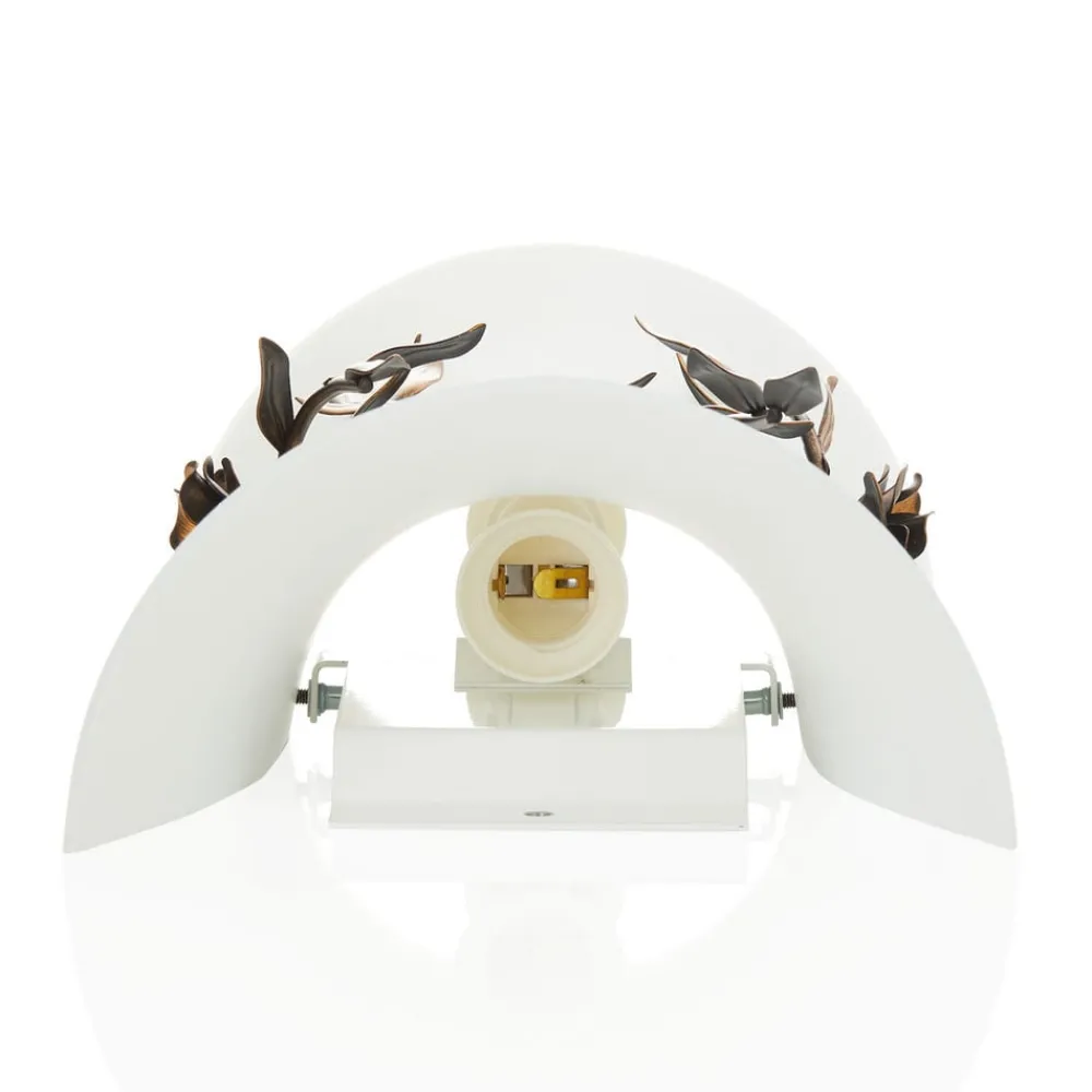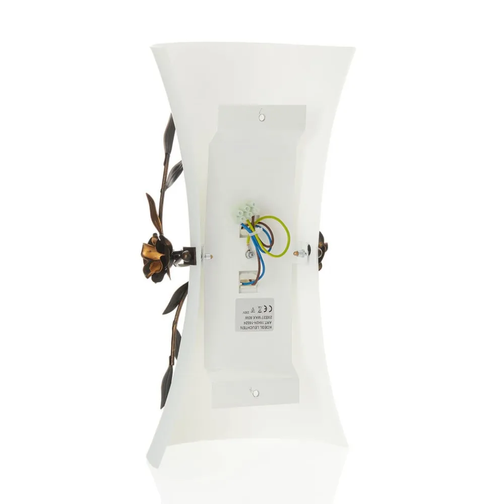2 lyskilder ROSE væglampe med frostet glasskærm og blomsterdekorationer ROSE væglampen giver en jævn, blød belysning og imponerer også med sit kunstneriske design. Den smukt designede skærm i opalglas er omkranset af antikguldfarvede blomster- og bladelementer. Lampen imponerer også med sin høje kvalitet i udførelsen.