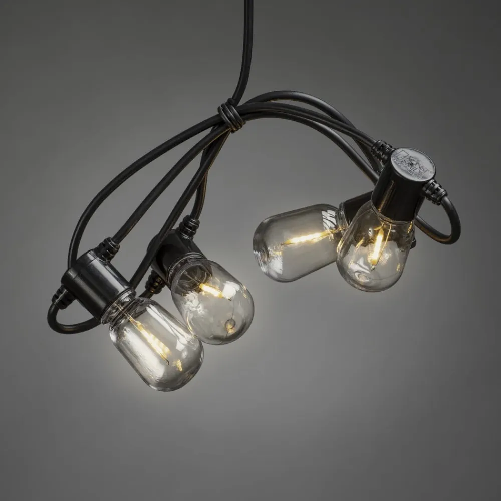Blødt skinnende lys – LED lyskæde beer garden, 20 stk. Tyve små og klare dråbeformede pærer udgør den moderne og dekorative lyskæde beer garden til udendørs brug. Uanset om det er på altanen, i haveskuret, på terrassen eller ved pergolaen, skaber lyskæden med de små pærer en hyggelig atmosfære overalt. Det er muligt takket være de integrerede LED’er, som udsender et meget varmt, ravfarvet lys til omgivelserne. Ud over et 10 meter langt forsyningskabel indeholder leveringsomfanget også en passende 6 V udendørstransformator – Lysudbyttet kan justeres på transformatoren