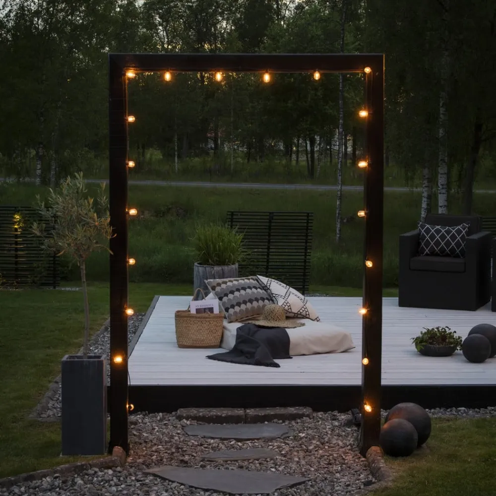Blødt, ravfarvet lys – LED-lyskæde beer garden, 40 stk. Den moderne LED-lyskæde beer garden skaber en helt særlig atmosfære i udendørsarealer med sine 40 klare dråbeformede pærer. Disse dråber indeholder moderne lysdioder, der skinner med et meget varmt, berstein-lignende lys og skaber en magisk stemning. Biergarten-kæden er ideel til at dekorere altaner, terrasser, pergolaer eller andre områder i haven og skaber den rette atmosfære til enhver tid, uanset om det er til en stor fest eller en hyggelig grillaften. Ud over et 10 m langt forsyningskabel leveres ølhave-LED-lyskæden også med en matchende 6 V udendørs transformer – Lysudbyttet kan justeres på transformeren