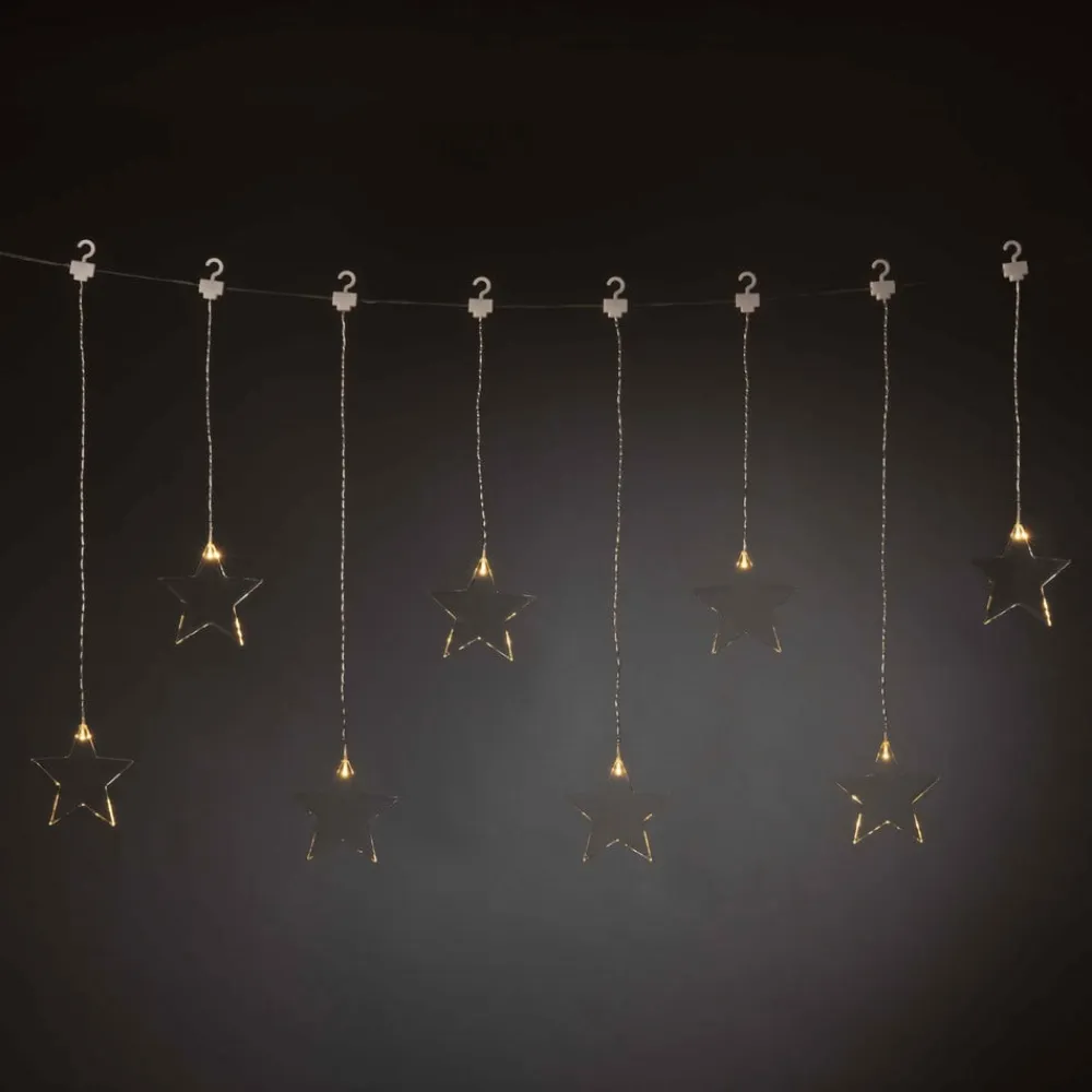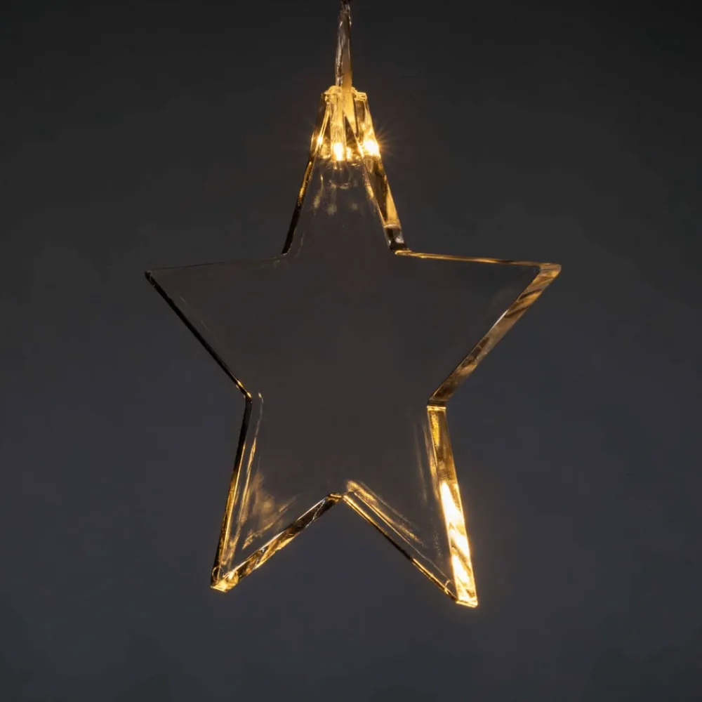 LED-lysgardinet er velegnet til indendørs brug, f.eks. foran et vindue: Det er udstyret med otte gennemsigtige stjerner af plast, som hænger i forskellige højder. Stjernerne er belyst af varm hvide LED’er.