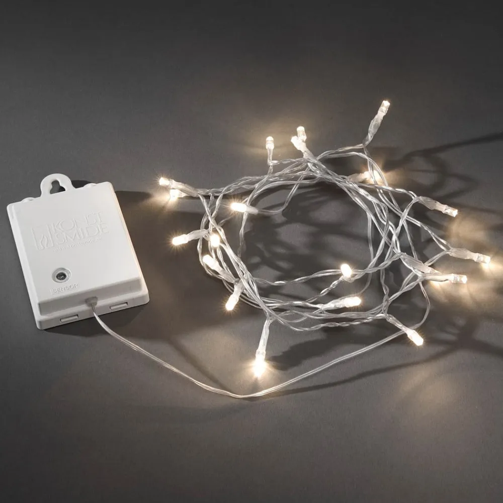 De strålende LED’er i farven varm hvid, sætter denne 20-delte lyskæde til udendørs brug flot imod omgivelserne. Lyskæden er udstyret med en tusmørkesensor, samt en timer (6 eller 9 timer ). Dette betyder at lyskæden begynder at lyse når det bliver mørkt, og lyser derefter – afhængig af den angivne tid – i 6 eller 9 timer. Dette gentages hver dag ved mørkets frembrud. Leveres uden batterier (4 x AA). De kan bestilles under tilbehør.
