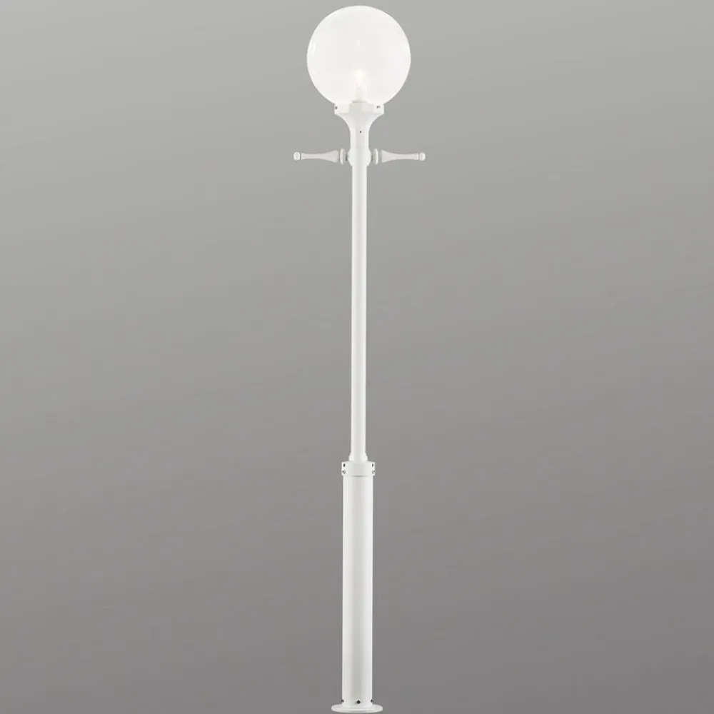 Det 240 cm høje Orion post-top armatur består af en mat hvidlakeret aluminiumsstolpe med en praktisk stigebeslag og en klar akrylsfærisk skygge. Ud over konventionelle glødelamper kan der også anvendes energibesparende versioner som lyskilder. Vi anbefaler brugen af moderne LED-lamper, som ikke kun giver ekstremt energibesparende og effektiv belysning, men som også har en meget lang levetid.