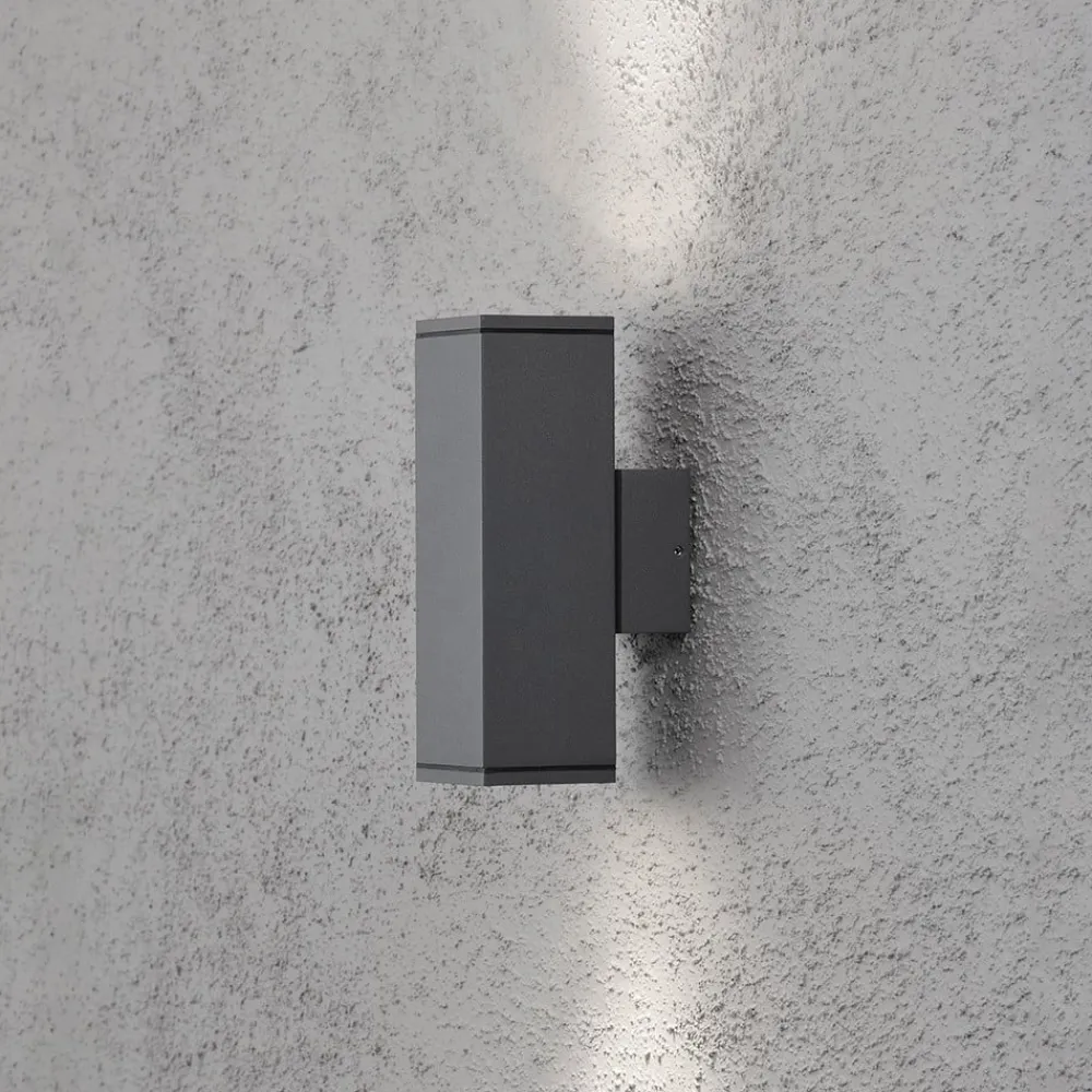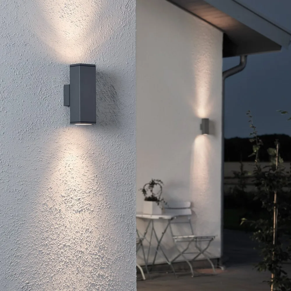 Den udendørs væglampe Monza er en enkel lampe med en geometrisk form. Det er fremstillet af aluminium og overfladen er lakeret i antracitfarve. Det generelt moderne look forstærkes af de to lysudgange i forskellig retning. Når lyskilden er tændt, falder lyset fra de anvendte GU10-pærer opad og nedad på væggen, og belyser dermed dit udendørs område på en helt enestående måde.