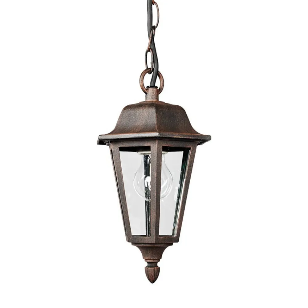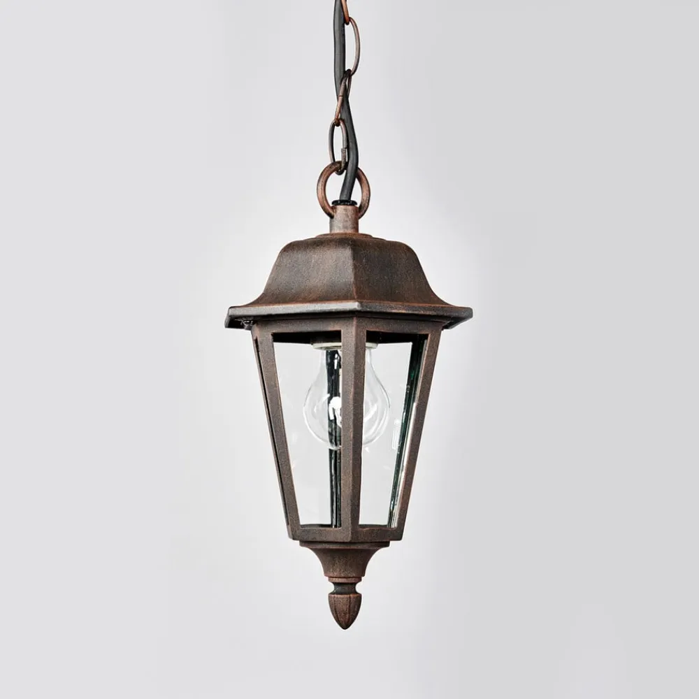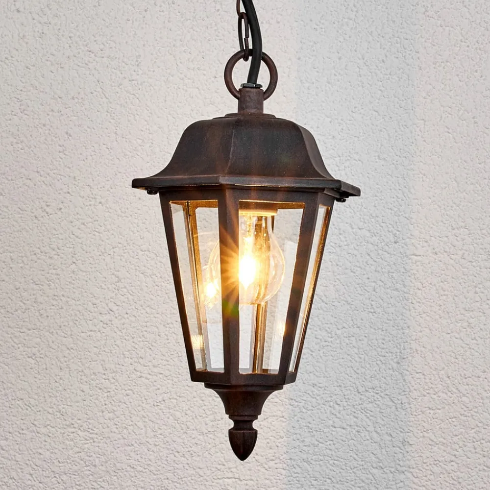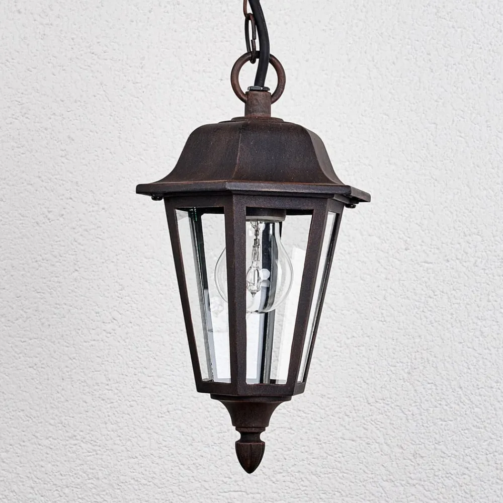 Smuk Lamina udendørs hængelampe med rustbrun overflade Den rustbrune metaloverflade ser meget elegant ud og giver Lamina et nostalgisk udseende og en antik effekt. Skærmen suppleres øverst af en slags tag, og seks klare glasplader er sat ind i rammen i siderne – hvilket får Lamina til at ligne en lygte, som vi kender den fra tidligere tider. Den udendørs hængelampe er velegnet til mange udendørs tage, især til altaner og terrasser, selvfølgelig.