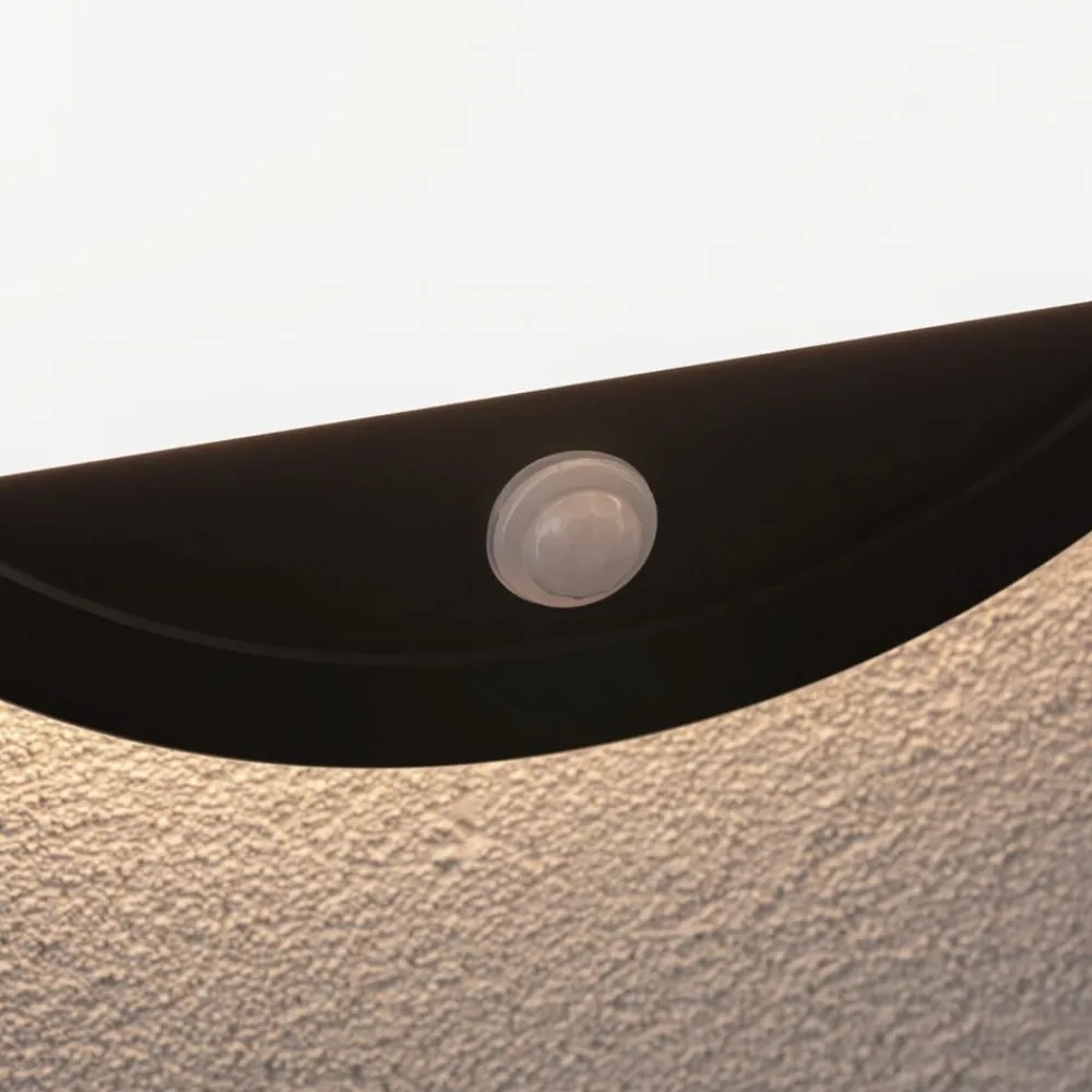 Lamina LED udendørs-væglampe i rund form med sensor Den runde Lamina LED udendørs-væglampe er udstyret med både en bevægelsessensor og en skumringssensor og sender ikke kun lys fremad, men også mod væggen takket være baggrundsbelysningen. Skumringssensoren tænder lyset i skumringen med 20 % lysstyrke og et varmt gyldent lys (2.200 K); så snart sensoren registrerer bevægelse, skifter lyset til 100 % lysstyrke og en varmhvid lysfarve (3.000 K). Derefter lyser den i 30 sekunder, hvorefter den skifter tilbage til 20 % og 2.200 K. Også velegnet til montering i loftet. Plastarmaturet er klassificeret som “havvandsbestandigt” og er derfor også velegnet til kystområder. Det varme, gyldne lys er insektvenligt.