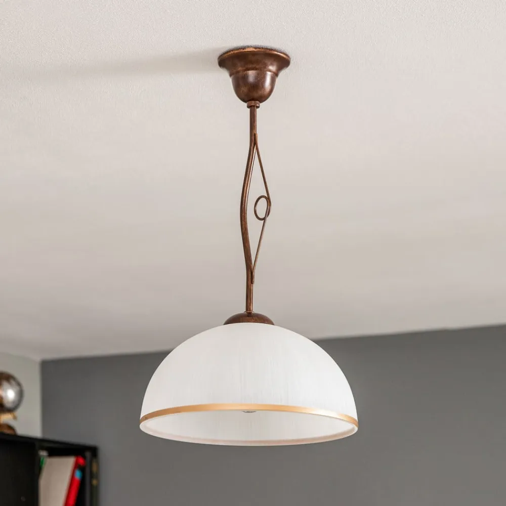 Hængelampen Roma i hvid og brun forener antik charme med moderne funktionalitet. Den er fremstillet af højkvalitetsstål og glas og er en robust og samtidig elegant løsning til belysning i stuen, køkkenet eller spisestuen. Dens konstruktion med 1 lyskilde sikrer en målrettet lysfordeling, der bader rummet i en varm og indbydende atmosfære. Kombinationen af hvid og brun giver lampen en tidløs æstetik, der passer harmonisk ind i forskellige indretningsstilarter.