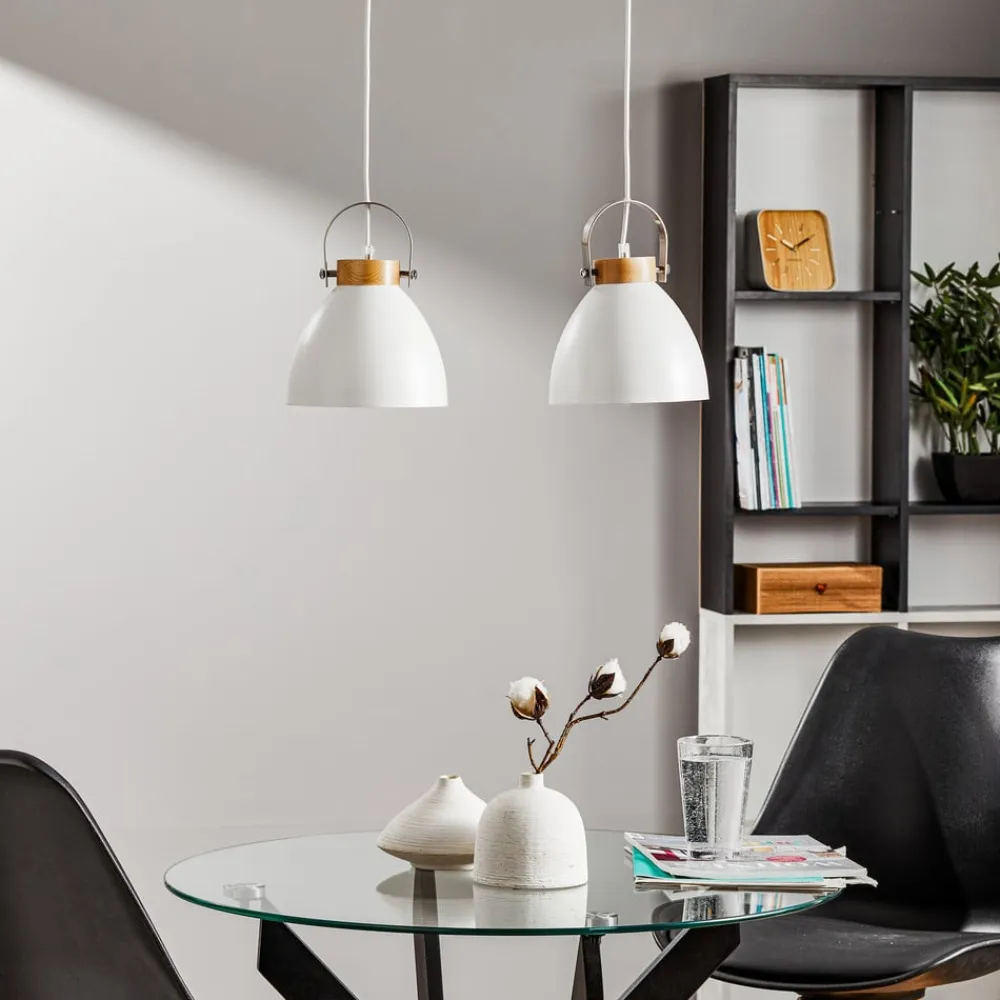 Pendellampen Bergen med 2 lyskilder er en stilfuld belysningsløsning til moderne boliger. Den er fremstillet af en harmonisk kombination af stål og lyst træ og passer perfekt ind i forskellige indretningsstilarter. Lampen er holdt i en elegant hvid farve, der suppleres af de naturlige træelementer og skaber en varm og indbydende atmosfære.