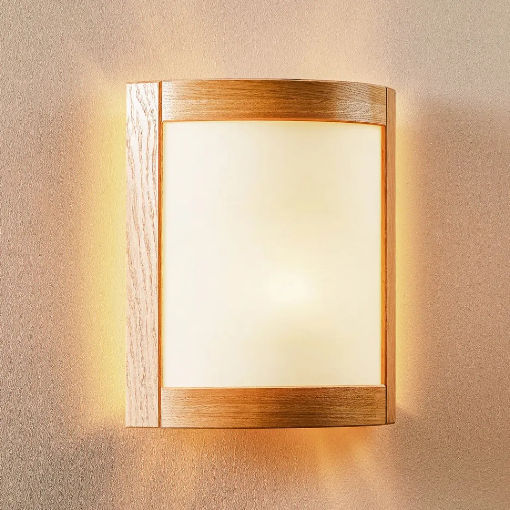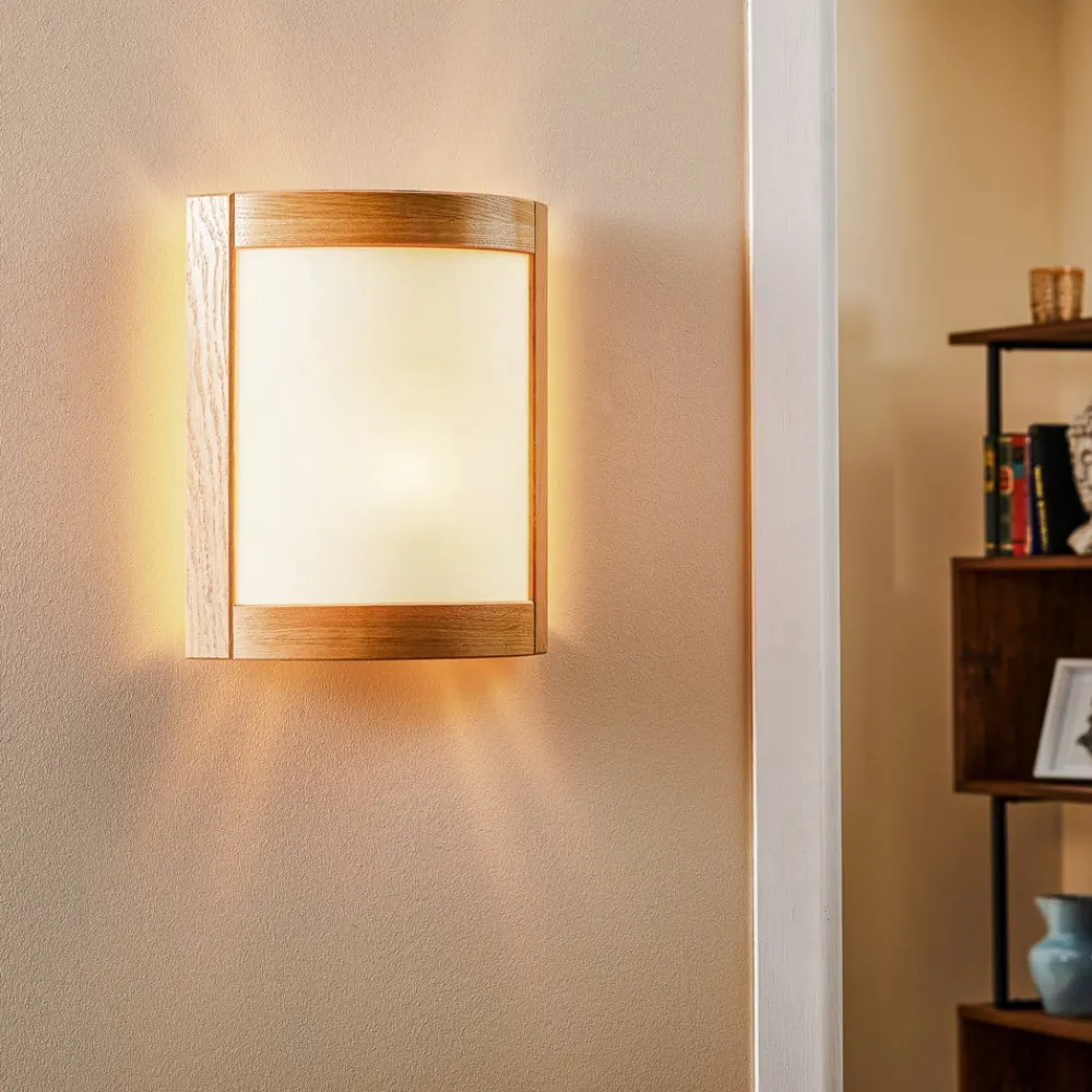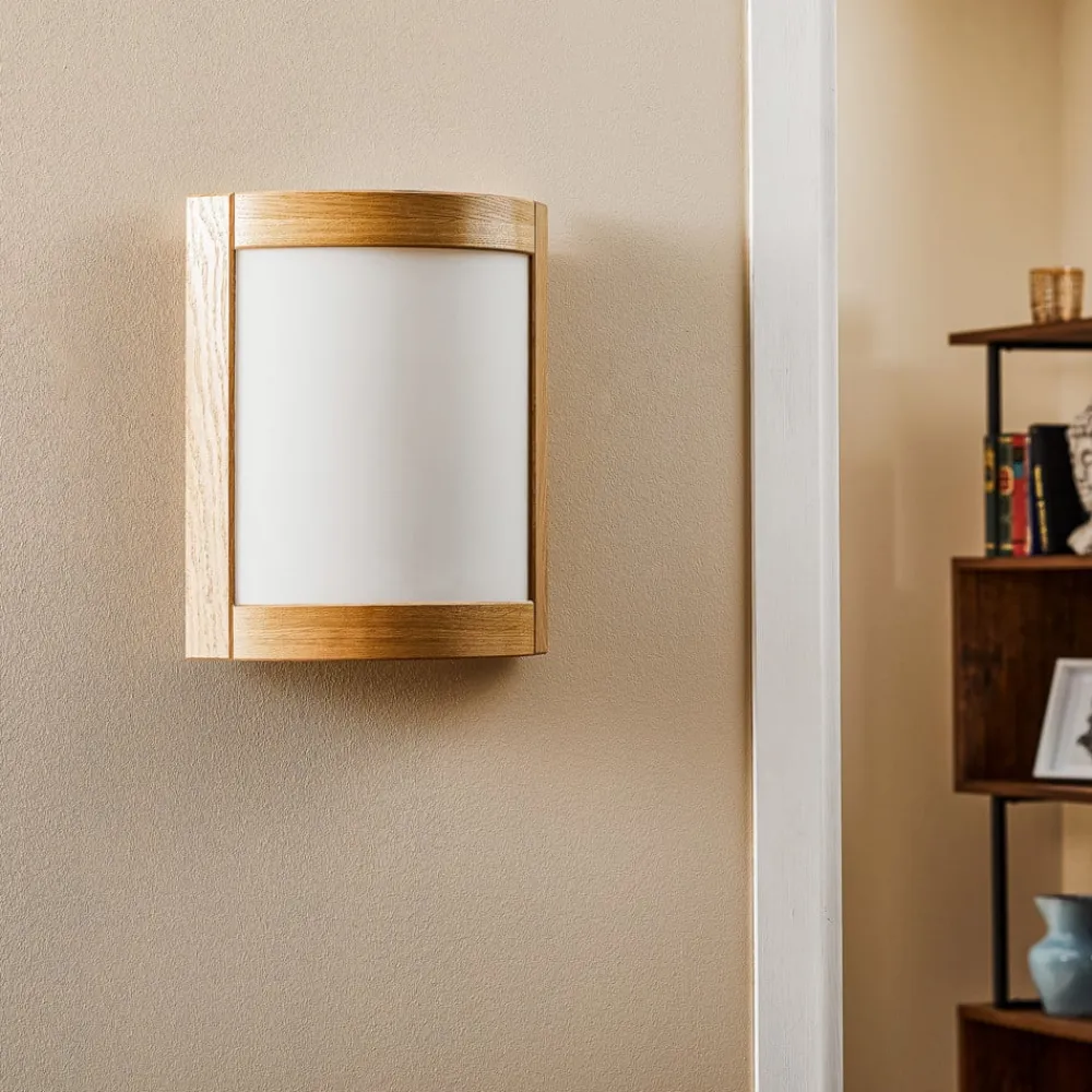 Væglampe Zanna i træ kombinerer rustik charme med tidløs elegance. Fremstillet af højkvalitets træ og glas passer denne lampe perfekt ind i forskellige indretningsstilarter, fra landlig til rustik. De varme nuancer i det lyse egetræ skaber en indbydende atmosfære i stuer og soveværelser samt i entreen og spisestuen. Træets naturlige årer gør hver lampe til et unikt stykke, hvor forskelle i farve og struktur understreger det enkelte eksemplars unikke karakter.