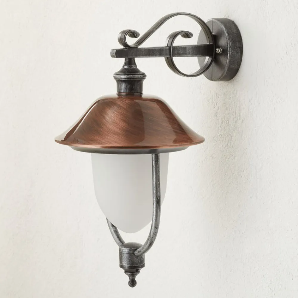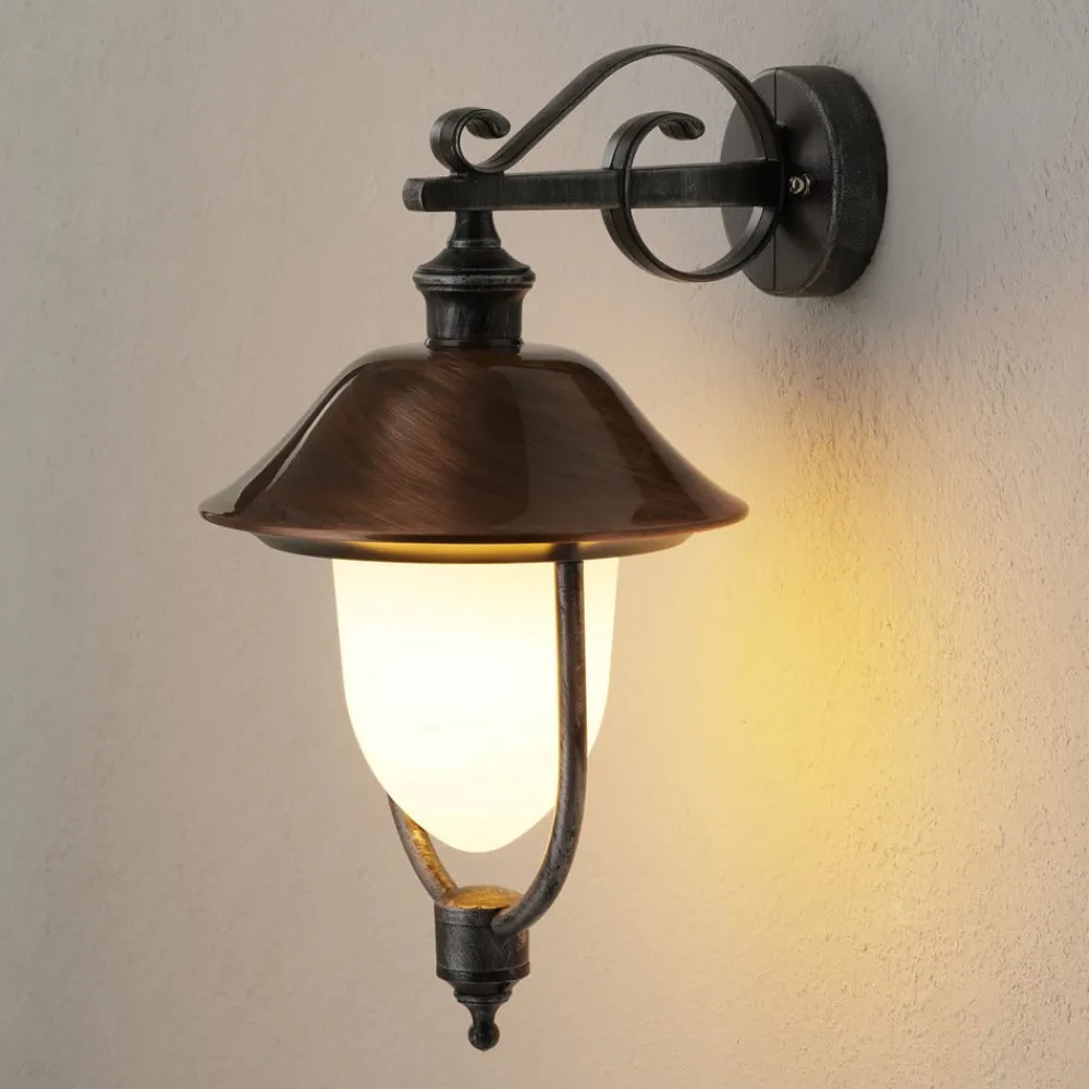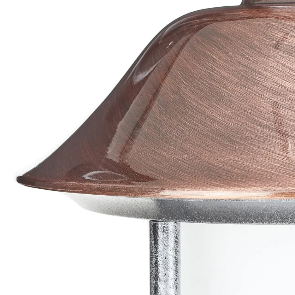 Flot udendørs væglampe Peggy i pendeldesign Den klassisk designede udendørs væglampe Peggy imponerer med sit smukke udseende. Den kobberfarvede skærm, som giver lyset det særlige, er et særligt blikfang. Peggy er fremstillet af glas og trykstøbt aluminium og er meget robust. Den giver også ideelle lysforhold på grunden, når det er mørkt. Den effektive udendørs væglampe er en berigelse for ethvert udendørs område. Energibesparende lamper og LED-lamper er også velegnede som lyskilder.