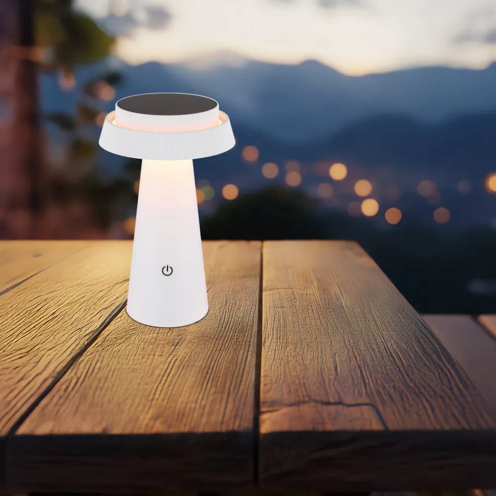 LED-solbordlampe 36624, opladelig via USB, CCT Denne LED-bordlampe af plast giver stemningsfuldt lys på terrassebordet, selv når der ikke er solskin nok, da den ikke kun kan bruges i ren soltilstand, men også kan oplades via et USB-C-ladekabel. Der medfølger ikke et opladningskabel. Lampen er udstyret med en berøringskontakt, som kan bruges til at tænde og slukke den i tre lysfarver (varmhvid belysning med 1.800 K, 2.700 K eller 3.000 K) og kan også dæmmes trinløst (200 – 20 lm) – med hukommelsesfunktion – inkl. genopladeligt batteri – ekskl. ladekabel – ladetider: via USB-C ca. 4 timer, via solar ca. 22 timer – lysvarighed ca. 12 timer.