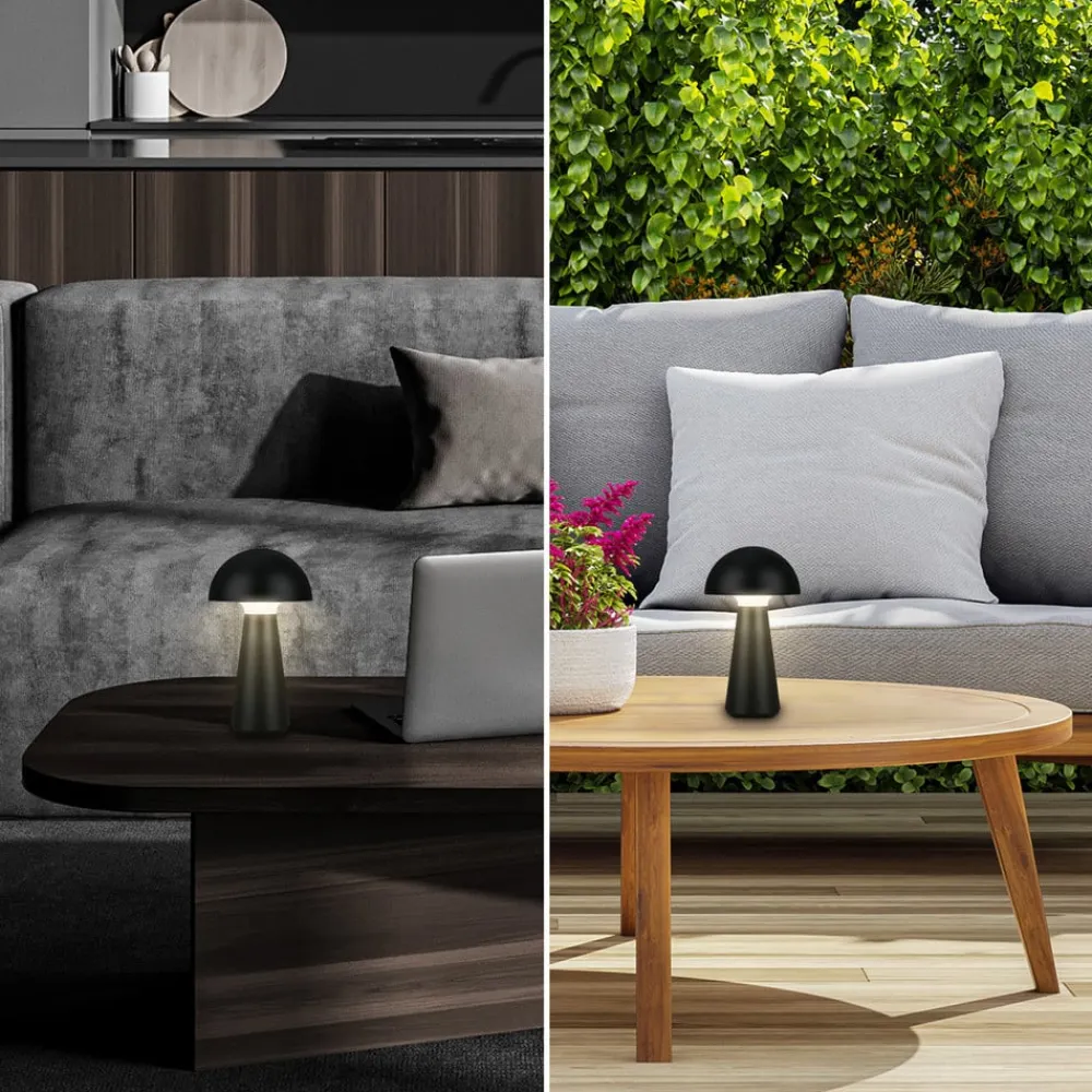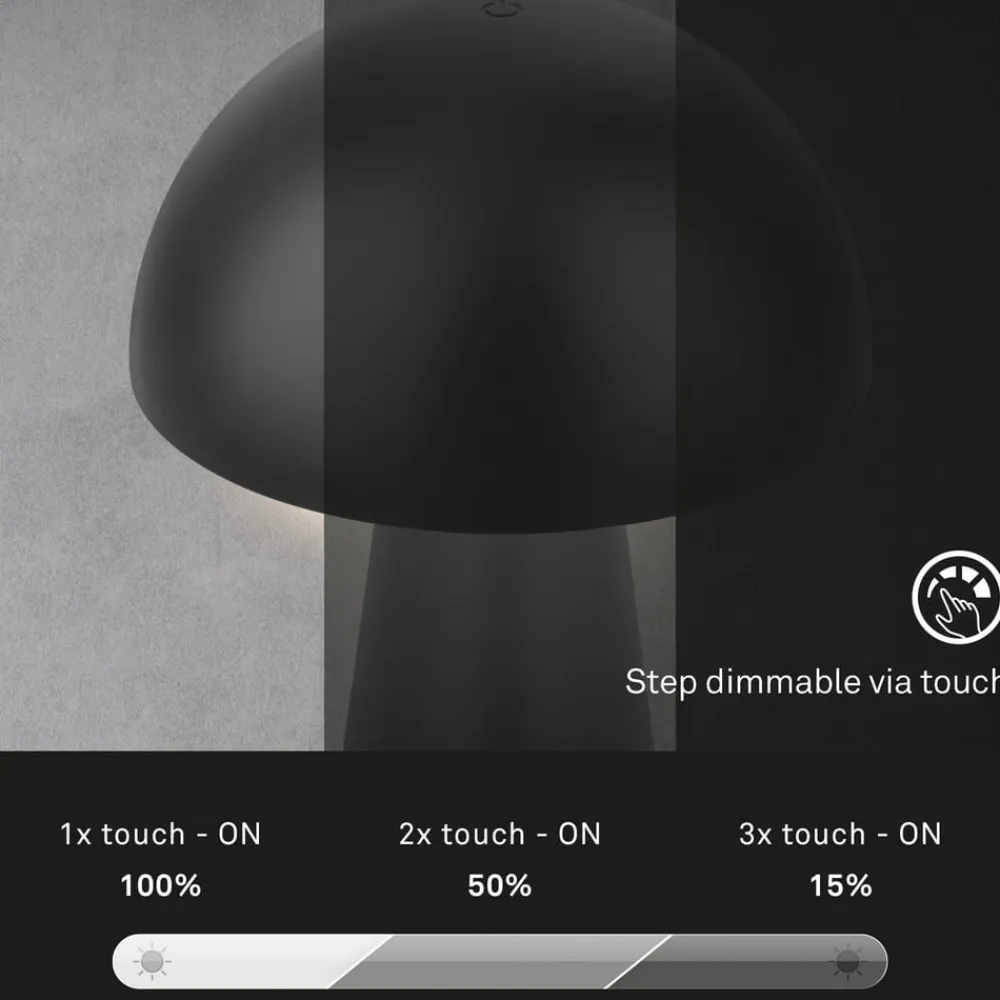 Batteridrevet LED-bordlampe Fungo til indendørs og udendørs LED-bordlampen Fungo med integreret batteri er formet som en champignon. Den er lavet af plast og udstråler det varme hvide lys fra de integrerede LED’er nedad, hvilket skaber en behagelig indirekte belysning. Takket være batteridrift og beskyttelsesklasse IP44 kan lampen ikke kun bruges indendørs, men også udendørs og lyser med et fuldt batteri på det laveste lysniveau i op til 18 timer. Lampen er udstyret med en berøringsdæmper og kan skiftes til tre lysstyrkeniveauer ved berøring. Filtglidere på undersiden af basen beskytter følsomme overflader mod ridser. – Leveres inkl. USB-C-ladekabel uden netadapter