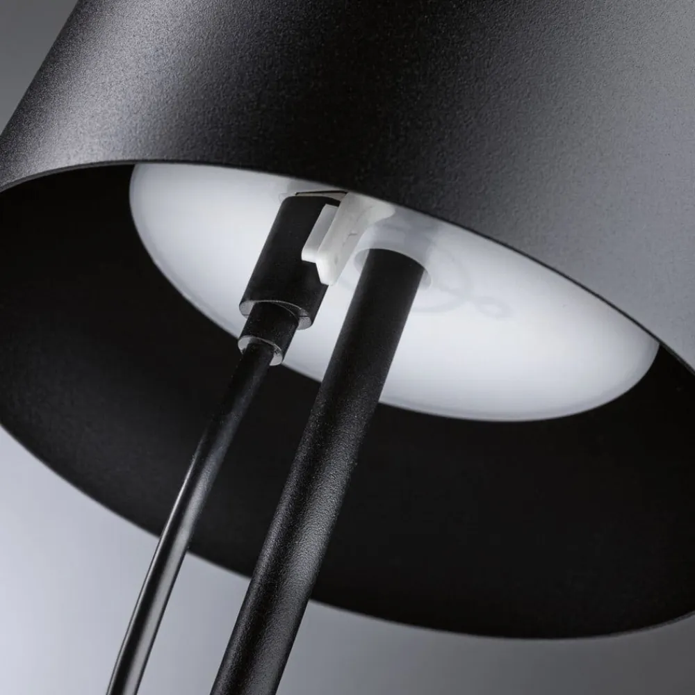 Mobil LED-bordlampe Gilo med genopladeligt batteri, skærm udformet som en keglestub Bordlampen Gilo er en visuelt elegant ekstra lyskilde til indendørs og udendørs brug. Lampen er lavet af plast med en mat finish og består af en rund base, en slank stang og en skærm i en tidløs kegleform. Sidstnævnte er udstyret med en satineret diffuser i top og bund. Takket være det genopladelige batteri kan Gilo betjenes uden strømtilslutning og genoplades indendørs i et tørt miljø ved hjælp af opladningsindgangen USB-C. – IP44 kapslingsgrad – egnet til udendørs brug – LED-modul og batteri kan udskiftes af en specialist – dæmpningsniveauer: 100 %, 10 % – driftstid pr. batteriopladning: > 8 timer ved 100 %, > 50 timer ved 10 % – opladningstid: 6 til 7 timer (inklusive opladningsindikator) – inklusive USB-opladningskabel; uden netadapter