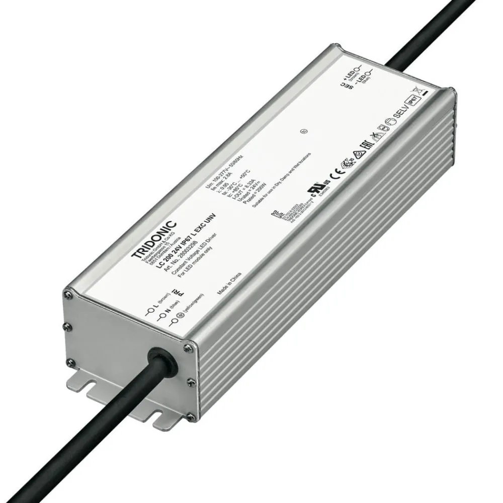 LED-driver LC 24V udgangskonstant IP67 L EXC UNV fra TRIDONIC – forskellige indgangsspændinger mulige, beskyttet mod vand Denne driver til indbygningsarmaturer til 24V LED’er er også velegnet til brug i fugtige miljøer, for eksempel til udendørs belysning. En særlig egenskab er muligheden for tilslutning til et bredt netspændingsområde. Det indkapslede aluminiumshus giver øget beskyttelse mod korrosion, og ind- og udgangskabler med kappe er også tilgængelige.