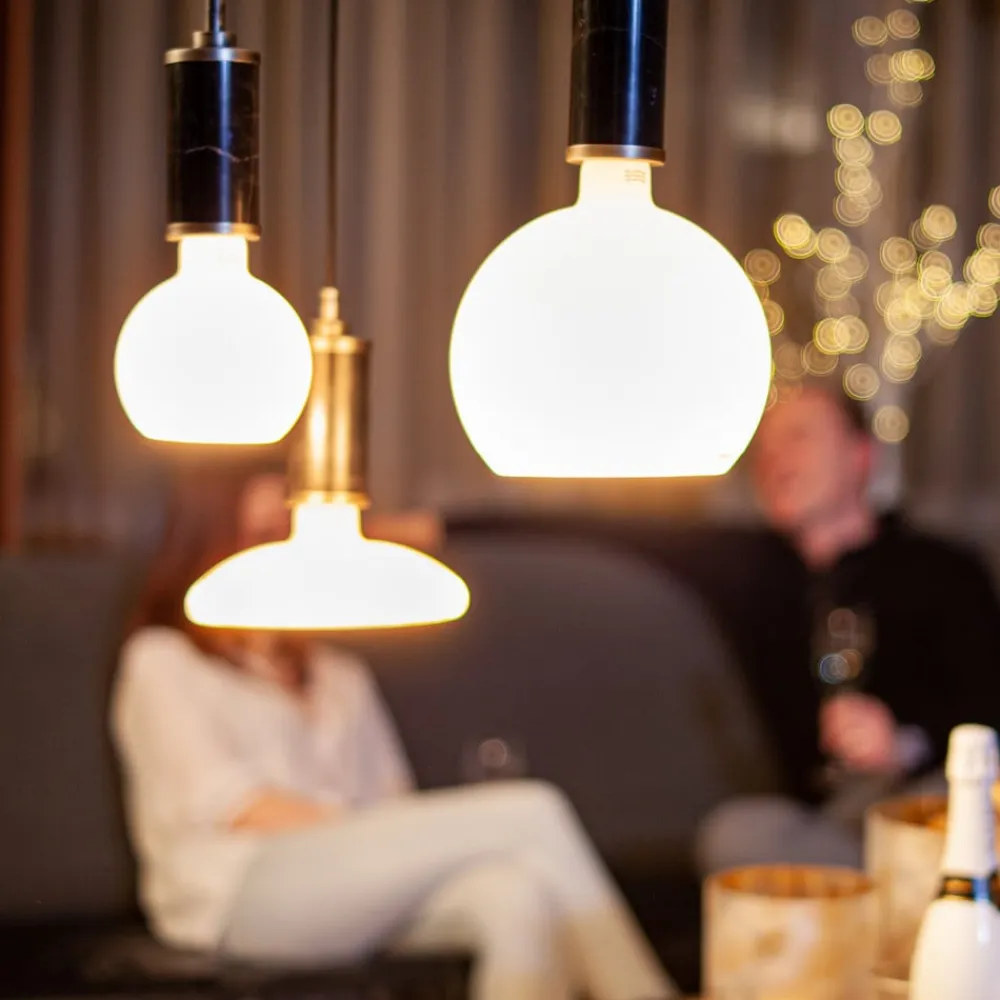 Mat LED-lampe G125, E27, 5W fra Ambient-serienGlashusets form, åbningen i toppen og den matte overflade gør LED-lampe til en dekorativ lyskilde, der især er overbevisende i åbent designede fatninger eller armaturer uden skærm. Takket være det dekorative udseende bliver lampen et smukt blikfang i boligområdet både når den er tændt og slukket. Med en ekstern fasedæmper er det desuden muligt at regulere lyskildens lysstyrke. Takket være den indbyggede Ambient Dimming-teknologi bliver lysfarven varmere under dæmpningen og skaber en behagelig atmosfære.- Varm lysfarve med 2.200 – 2.700K (Ambient Dimming)- Dæmpbar med ELTAKO, Jung, GIRA- Meget god farvegengivelse Ra 90- Udmærket med Plus X Award 2022/2023 i kategorierne Innovation, Høj kvalitet og Design.