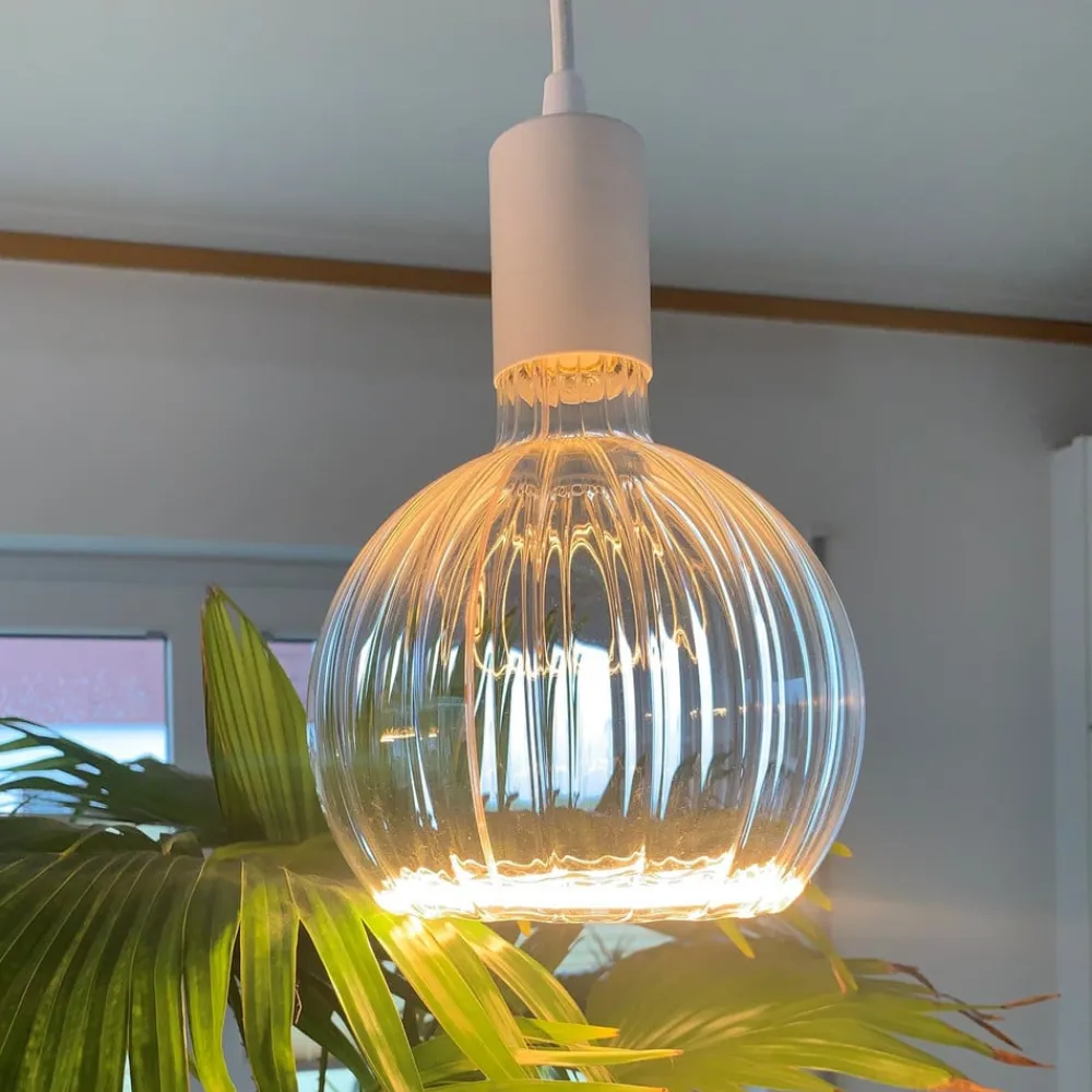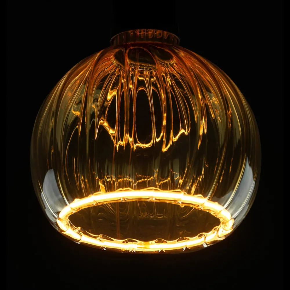 Dekorativ LED-lampe G150, E27, 4W lige guldDen store LED-lampe har et guldfarvet glas med lodrette striber på ydersiden. Glassets varme farve skaber en hyggelig tone i stuen. LED-kuglelampen er vidunderligt velegnet til brug i åbent designede armaturer, f.eks. pendellamper uden skærm. Lysstyrken kan reguleres med en kompatibel ekstern fasedæmper.- varm lysfarve med 2.200 K- dæmpbar med ELTAKO, Jung, GIRA- meget god farvegengivelse Ra 90- belønnet med Plus X Award 2022/2023 i kategorierne Innovation, Høj kvalitet og Design.