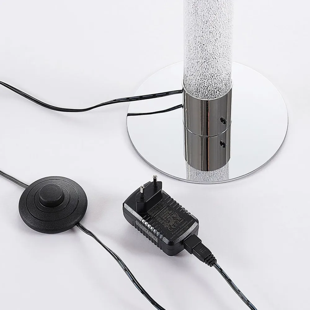 Den runde lampesokkel er forkromet, og gulvlampen Hadis har et ekstravagant krystaludseende, der skaber en smuk glans og gør lyset særligt glamourøst.