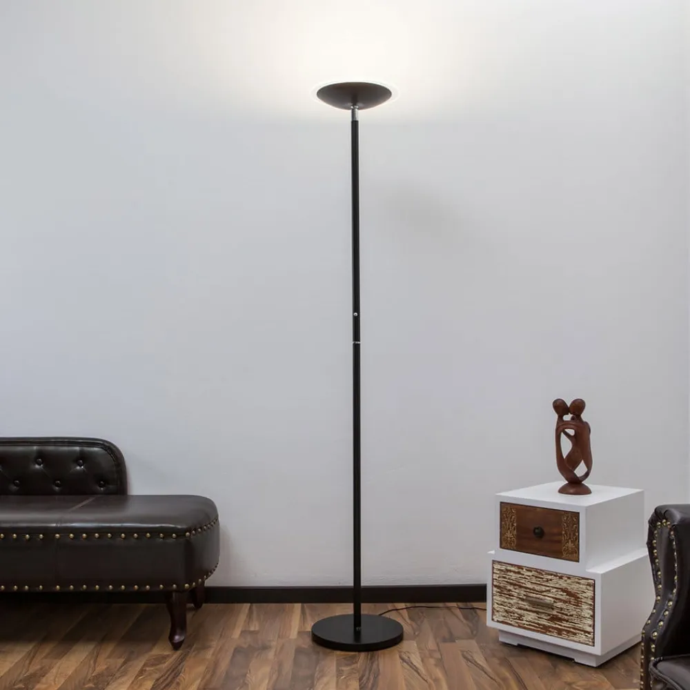 Der er næsten ingen hjem, hvor man ikke finder en uplight. Det er let at forstå, for uplights er dæmpbare og skaber en utrolig smuk lyseffekt med deres indirekte lys. I dette tilfælde forstærkes dette yderligere af, at metallet går igen som materiale fra foden over stativet til den skålformede lampeskærm, for det betyder, at lyset faktisk udelukkende strømmer mod loftet og blidt fylder rummet. Denne egenskab har uplight sikkert også sit navn at takke for, som derfor er meget passende valgt. Over denne loftskål sidder en klar glasplade. I midten af stativet er der en kontakt, der samtidig fungerer som trykknapsdæmper. Et kort tryk aktiverer tænd/sluk-funktionen, mens et længere tryk ændrer lysstyrken. En hukommelseseffekt sikrer, at den sidst valgte lysstyrke ikke ændres, når lampehovedet tændes igen. Lampehovedet kan vippes op til 45°.