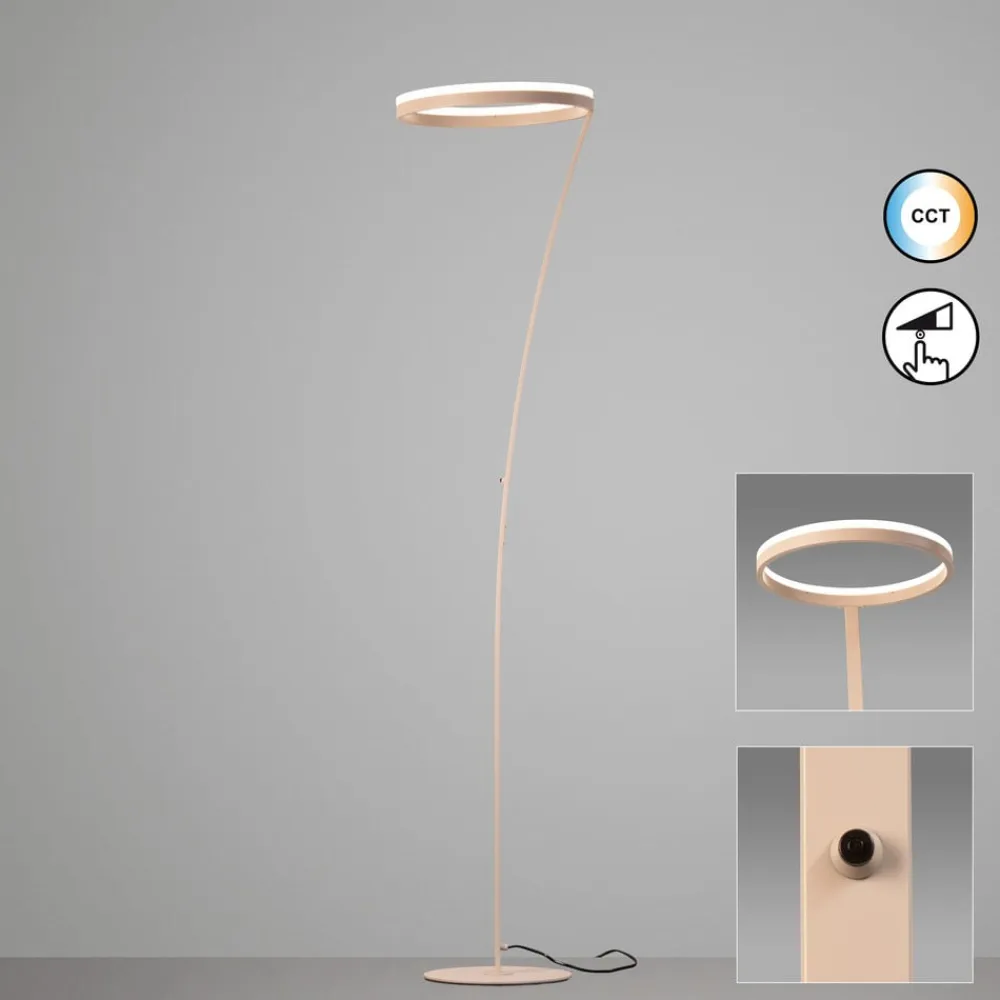 LED-gulvlampen Sirko overbeviser med sit moderne design og den sandfarvede overflade i højkvalitetsmetal. Med den integrerede CCT-funktion tilbyder den en tretrins justering af lysfarven, der spænder fra varmhvid til universalhvid. Denne alsidighed gør det muligt at skabe forskellige lysstemninger, der passer både til stuen og spisestuen. De fastmonterede LED’er sikrer en energieffektiv belysning og bidrager til produktets lange levetid.