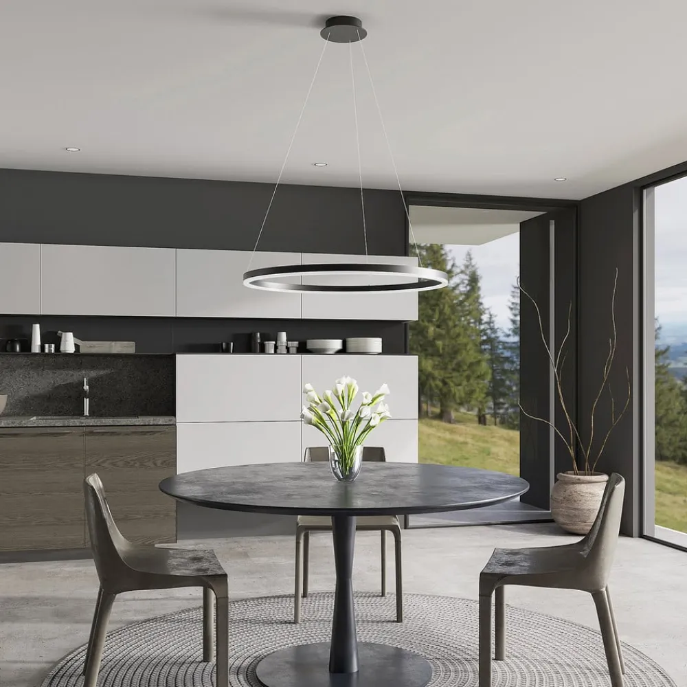 Albiona ringformet LED-pendellampe i sort – perfekt til køkkener og spisestuer Albiona er en lyskilde, der med sin moderne, minimalistiske ringform ser særligt stilfuld ud i moderne interiører. Pendellampen strækker sig ud i rummet på tre filigrane ledninger og domineres visuelt af den sorte metalring, på hvis underside de lyse, effektive LED’er er indlejret og giver et varmhvidt, hyggeligt skær. Stilfuldt design med et særligt udtryk!