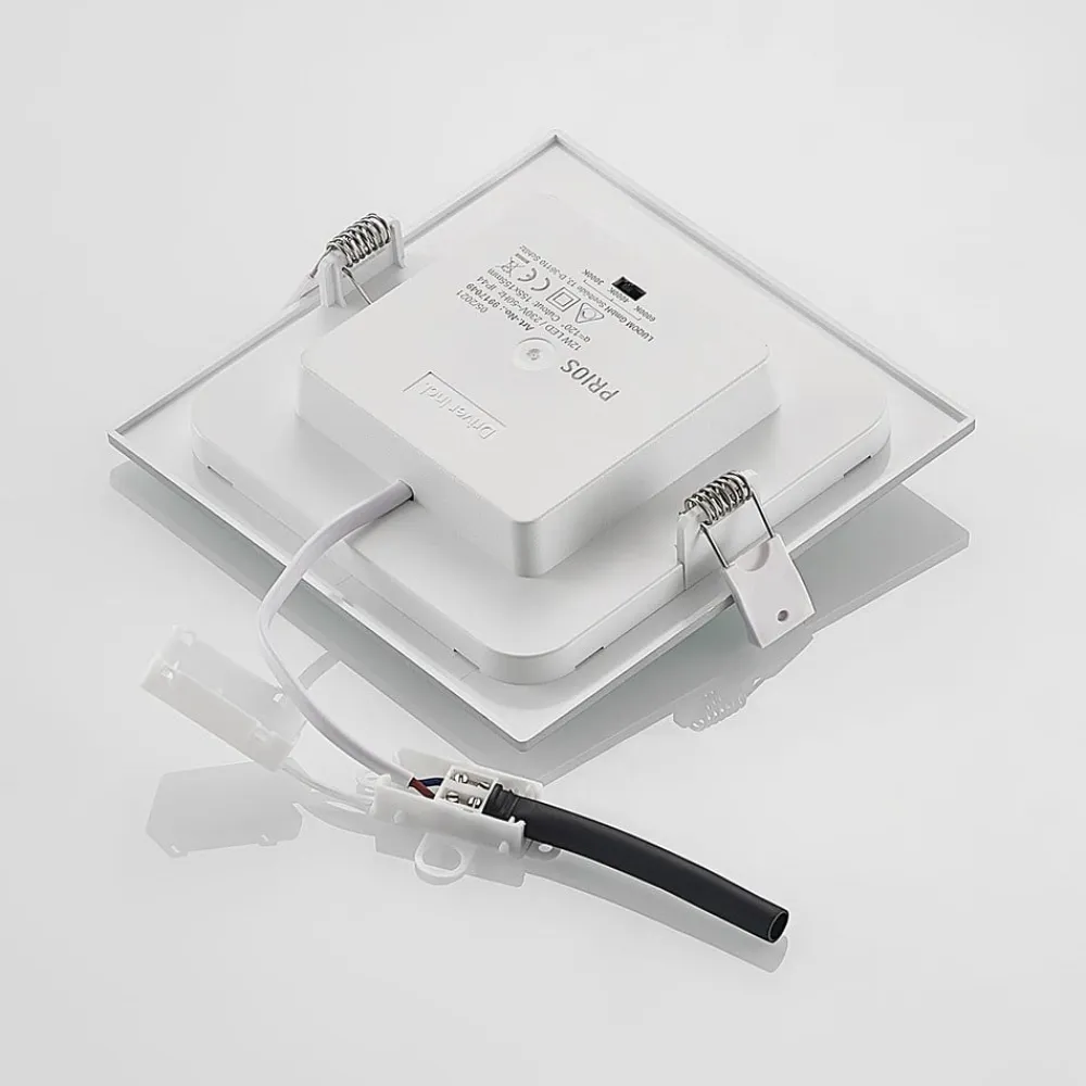 Sølvfarvet LED-indbygningsspot Helina i firkantet form, IP44, dæmpbar, forindstillelig lysfarve Helina har en firkantet grundform og er beregnet til montering i loftet. Designet med den kantede, sølvfarvede ramme har et behageligt enkelt og tidløst udseende, hvilket betyder, at armaturet kan bruges på mange forskellige måder, også i et kommercielt miljø. Huset er lavet af robust polykarbonat, og det faktum, at Helina også kan bruges i fugtige rum takket være IP44-beskyttelsesgraden, øger anvendelsesmulighederne. Et andet plus er, at lysfarven også kan indstilles efter behov; der er en DIP-kontakt på huset til dette formål, så man kan vælge farvetemperaturen før installationen. Dæmpning er også garanteret, hvis der findes en ekstern lysdæmper – DIP-kontakt til forudindstilling af lysfarven – IP44 til badeværelser og fugtige rum – Robust polykarbonathus og aluminiumsclips til nem installation – Ekstern dæmpning