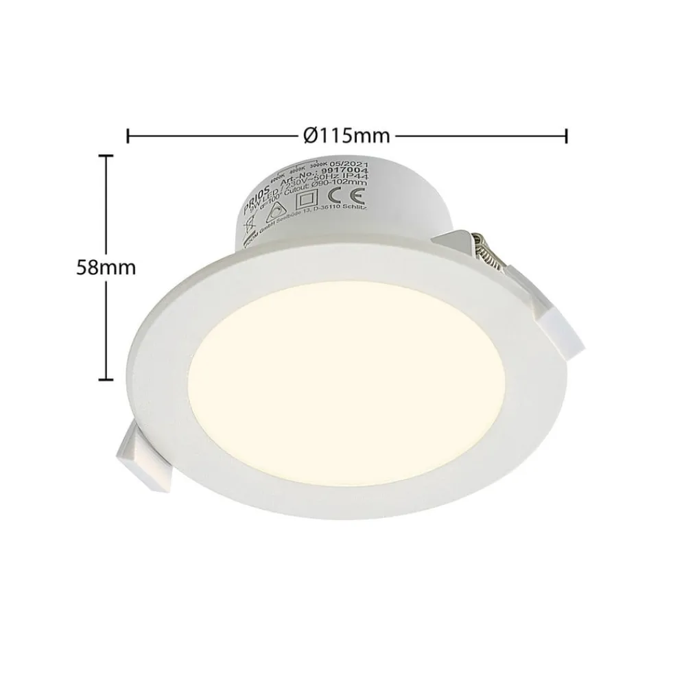 Hvid LED-indbygningsspot Rida i rund form, lysfarve kan justeres før installation via DIP-kontakt, IP44, sæt med 3 stk. Rida scorer med god funktionalitet og er en lyskilde til mange formål, uanset om du vil bruge LED-indbygningslampen privat eller kommercielt. Armaturhuset er rundt og hvidt, hvilket gør det usædvanligt enkelt og tidløst, hvilket taler for dets alsidige brug. Takket være den brede strålevinkel kan et rum belyses over et større område, men til større rum er det stadig tilrådeligt at bruge flere armaturer for at opnå optimale belysningsresultater. Den høje kapslingsgrad betyder, at LED-indbygningsspottet er godt beskyttet mod fugt og fugt og derfor også uden tøven kan bruges i badeværelser eller andre fugtige rum. Du skal først beslutte dig for en lysfarve under installationen, så kan du vælge en af tre farvetemperaturer via en DIP-kontakt og derefter installere armaturet. Rida kan også dæmpes eksternt, hvis en tilsvarende dæmper leveres via husinstallationen og kan bruges. Lysstyrken på de permanent installerede LED’er kan derefter justeres efter behov – Kapslingsgrad IP44 til brug i fugtige rum – Lysfarve kan indstilles via DIP-kontakt før installation – Bred strålevinkel på 100° – Leveres i et praktisk sæt med 3 stk