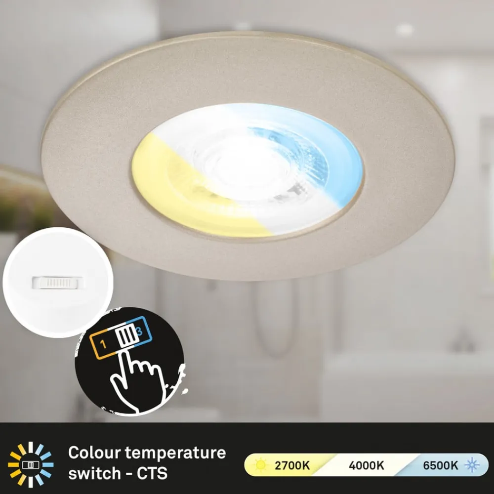 LED-indbygningsspot 7605 med IP44-beskyttelse og CCT-kontakt i et sæt med 3 stk. Alsidig, takket være IP44-beskyttelse, også i badeværelset eller andre fugtige rum, er dette LED-indbygningsspot 7605, som leveres i et fordelagtigt sæt med 3 stk. Hvert spot har en kontakt på bagsiden til justering af lysfarven. Valgbare lysfarver: Varm hvid (2.700 K), universal hvid (4.000 K), dagslys (6.500 K)