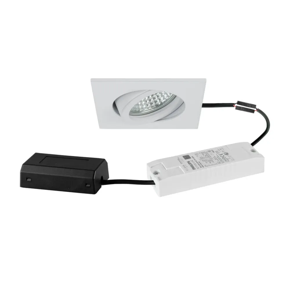 Tirrel-S indbygningsspot med DALI-dæmpbart styreapparat og tilslutningsboks Tirrel ALS er et kvadratisk indbygningsspot med LED, der leveres som sæt med et dæmpbart, elektronisk styreapparat og en tilslutningsboks. Spottet kan monteres i lofter uden brug af værktøj ved hjælp af installationsfjedre, og lampehovedet i huset kan drejes 20° for at justere belysningen. Armaturet med en sølvfarvet reflektorpære med rotationssymmetrisk, smal bredstrålende lysfordeling og den transparente glasafskærmning sikrer optimal lysfordeling og høj lysudbytte – Tilladt omgivelsestemperatur (ta): -20 °C – +25 °C – Beskyttelsesklasse (EN 61140): II, kapslingsgrad (DIN EN 60529): IP20 – med elektronisk forkobling, DALI-2 dæmpbar – med tilslutningsboks – uden synlig snapring