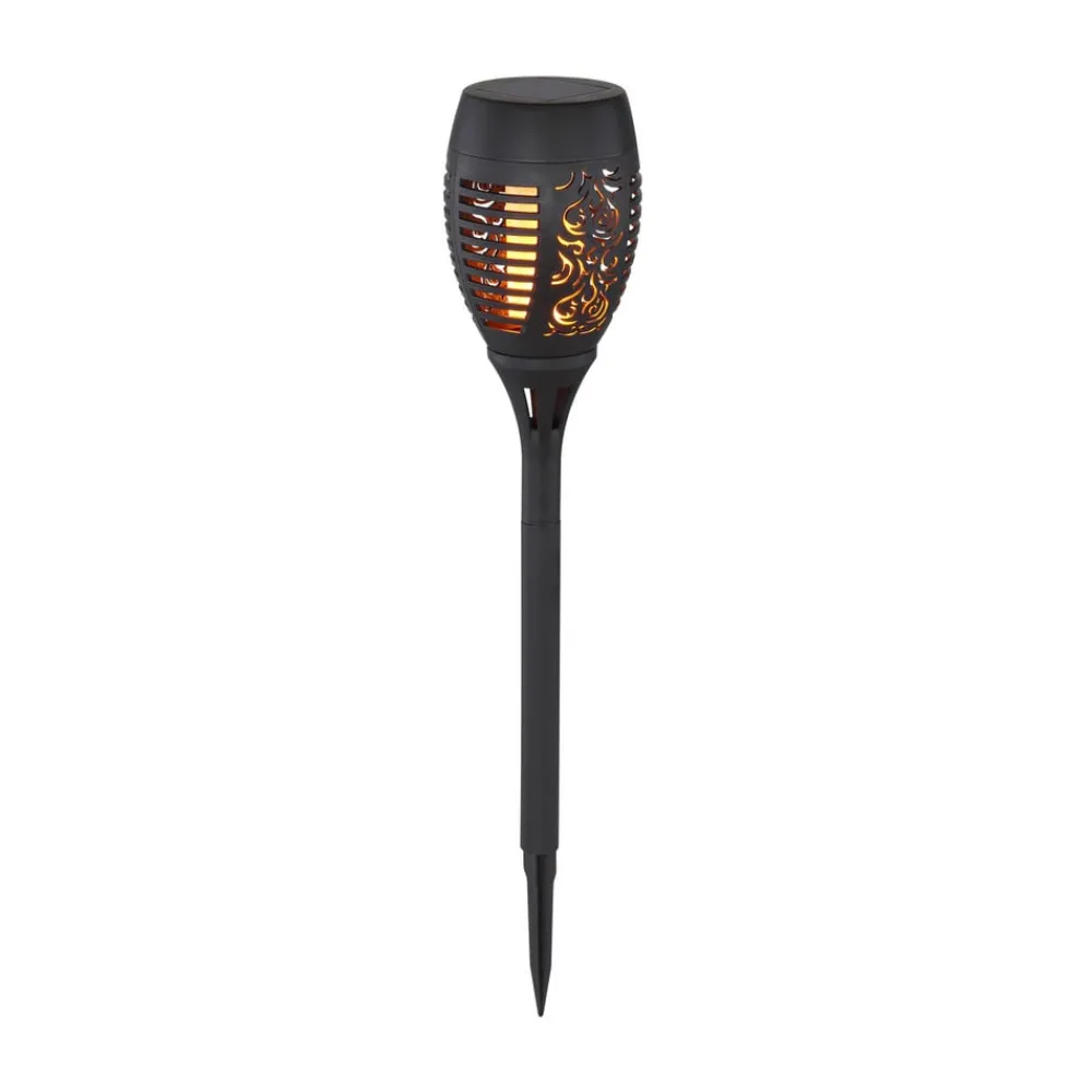 LED-lampe med jordspyd 33535-2 med fakkeleffekt i sæt med 2 Solcellelampen i fakkeldesign med langt jordspyd og dekorativ gennembrudt skærm, som leveres i et praktisk sæt med 2, har ekstra varme LED’er, der efterligner effekten af en flamme.
