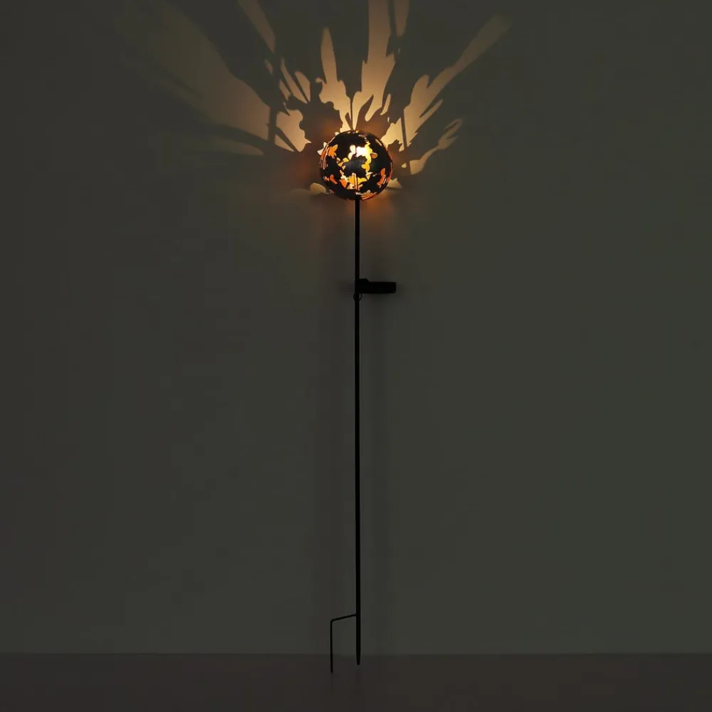 LED-solcellelampe 36747 i kugleform med jordspyd Skærmen på denne solcellelampe med langt jordspyd er designet i form af mange ahornblade, der danner en kugle. Den varmhvide LED i kuglen skaber flotte lyseffekter.