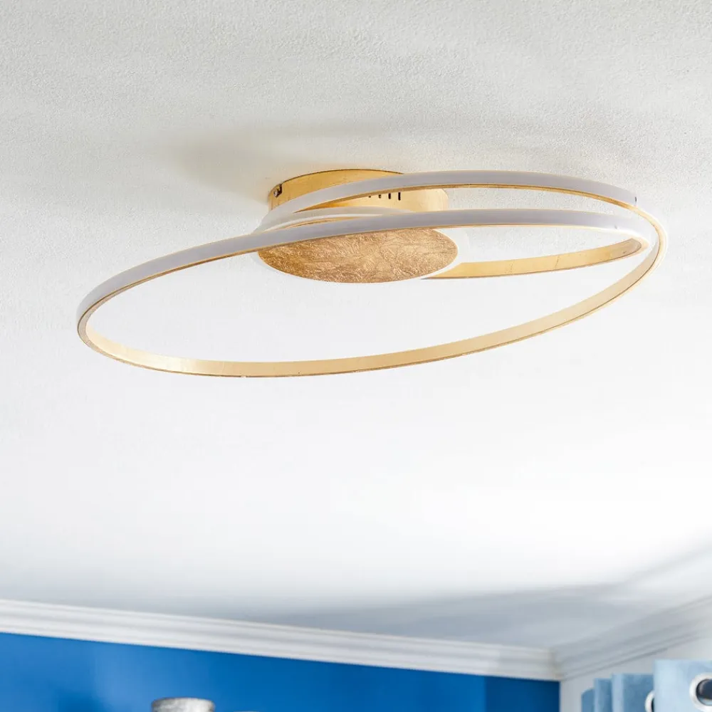 Dorle LED-loftlampe i gyldent design med praktisk dæmpbar funktion Dorle er den perfekte følgesvend, når det gælder interiørbelysning. Den runde LED-loftlampe har et rundt design, der består af et loftbeslag og en cirkulær stiver. Dens ydre LED’er er dæmpbare, så den altid kan give den rigtige lysstyrke og atmosfære. Lyset kan tændes og slukkes som normalt med en almindelig vægkontakt. Takket være 3-trins dæmpningsteknologien med integreret slukfunktion kan den også dæmmes til tre forskellige lysstyrkeniveauer ved at trykke på kontakten flere gange: 100 %, 60 % og 20 %. Dorle LED-loftlampen kombinerer et moderne, dristigt design med praktiske funktioner og er ideel til installation i en stue, spisestue eller et soveværelse.