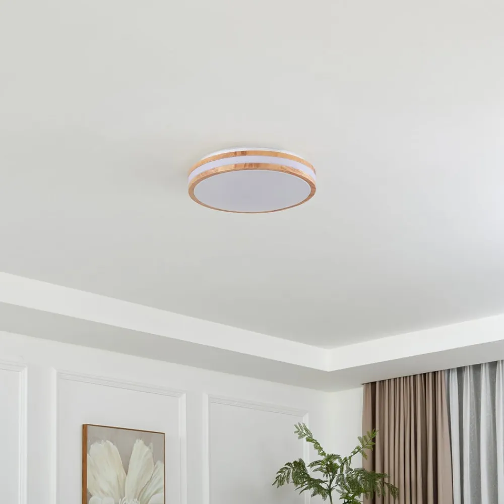 Rund Emiva LED-loftlampe af træ med praktisk CCT-funktion Emiva LED-loftlampen kombinerer moderne design med varmen fra træelementer og tilbyder en stilfuld belysningsløsning, der passer perfekt ind i moderne og skandinavisk interiør. Med en diameter på 39,5 cm er denne loftlampe et blikfang, der ikke kun imponerer med sit æstetiske udseende, men også med sin innovative kontrollerbare lysfarve. Det gør det muligt at justere lysfarven efter den ønskede atmosfære – fra varme toner til en hyggelig stemning til køligere nuancer, der fremmer koncentrationen. CCT-funktionen styres ved at trykke gentagne gange på en almindelig vægkontakt.