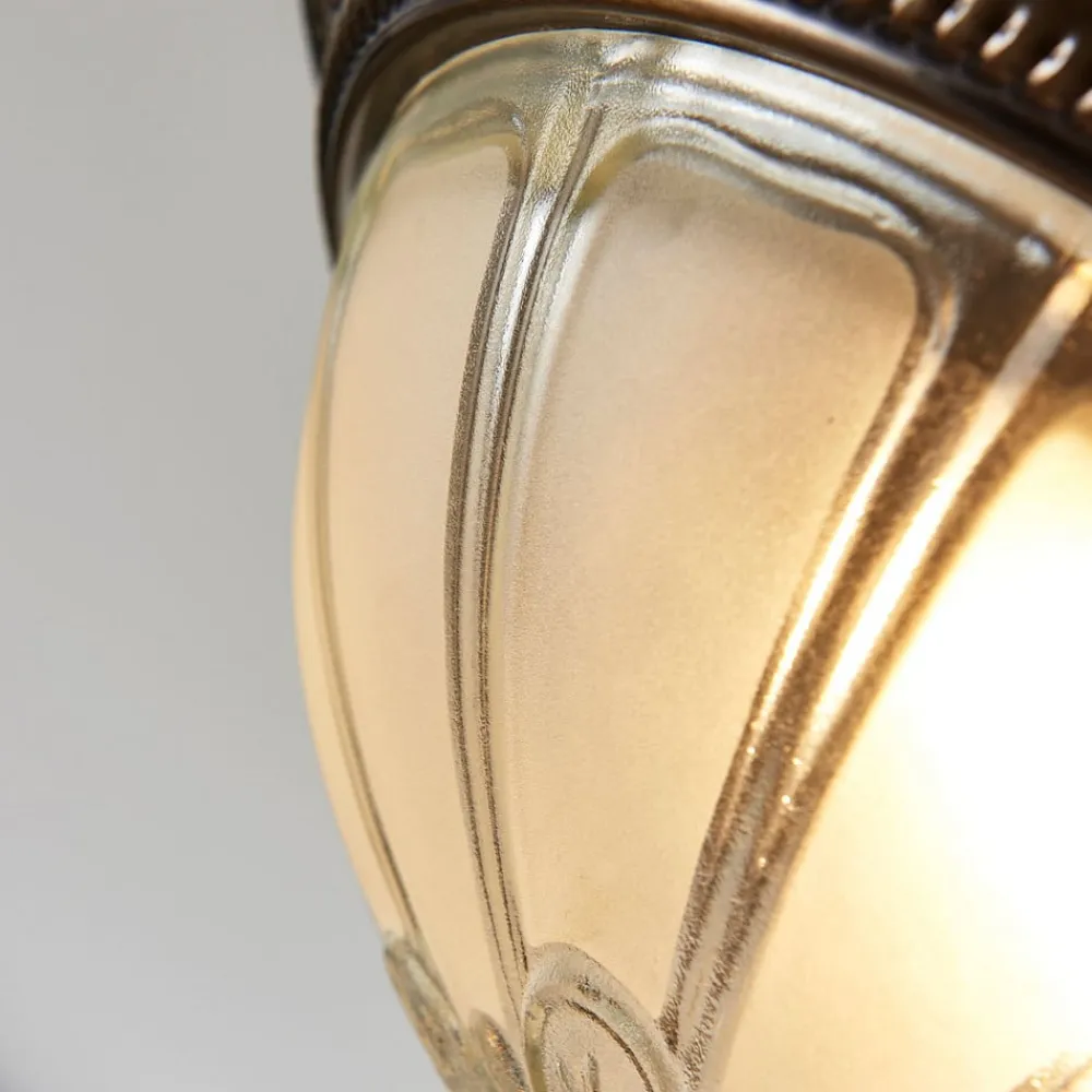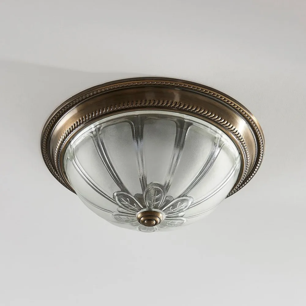 Henja LED-loftlampe med antik messingfarvet kant og kuppelformet lampeskærm i glas, dæmpbar i tre trin med en vægkontakt Henja har en rund grundform og er en lyskilde med et kunstnerisk design. LED-loftlampen drives af energibesparende, varmhvide LED’er og giver et behageligt lys til hyggeformål. Over LED’erne sidder en smukt dekoreret glaskuppel, som for det meste er lavet af ætset glas, men også har nogle klare områder, hvilket giver den et særligt individuelt udseende. Der er en lille metalpind i bunden og en dekorativ metalkant i antik messing i toppen for at fuldende det samlede udseende af Henja LED-loftlampen. LED-loftlampen kan dæmpes i tre trin (100%/50%/10%/off) ved hjælp af vægkontakten, hvilket gør belysning med Henja særlig praktisk.