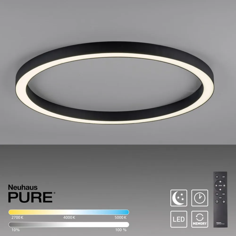 Den runde LED-loftlampe Lines fra Paul Neuhaus PURE overbeviser med sit puristiske design, som gør, at den passer godt ind i forskellige boligområder. Lyset stråler ned mod gulvet og kan styres med den medfølgende fjernbetjening. Det er muligt at ændre lysfarven fra varm til universalhvid. Desuden er loftlampe dæmpbar trinløst. Det er således muligt at tilpasse lysforholdene helt efter individuelle behov. Takket være den integrerede hukommelsesfunktion vender lampen tilbage til den sidst valgte lysindstilling, når den tændes.
