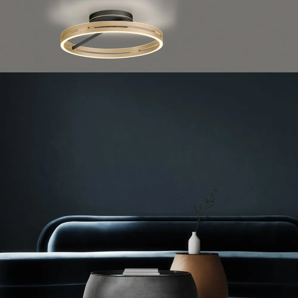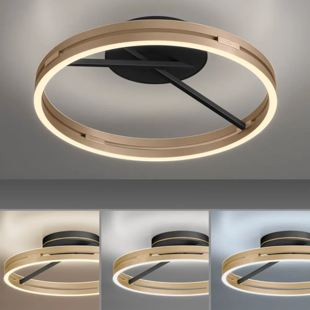 LED-loftlampe Loop overbeviser med sit moderne design til stuer og opholdsrum. Den ringformede krop af aluminium er udstyret med LED’er på oversiden og undersiden, så der opnås indirekte og direkte belysning. Lysstyrke og lysfarve (varmhvid til universalhvid) kan styres med den medfølgende fjernbetjening.