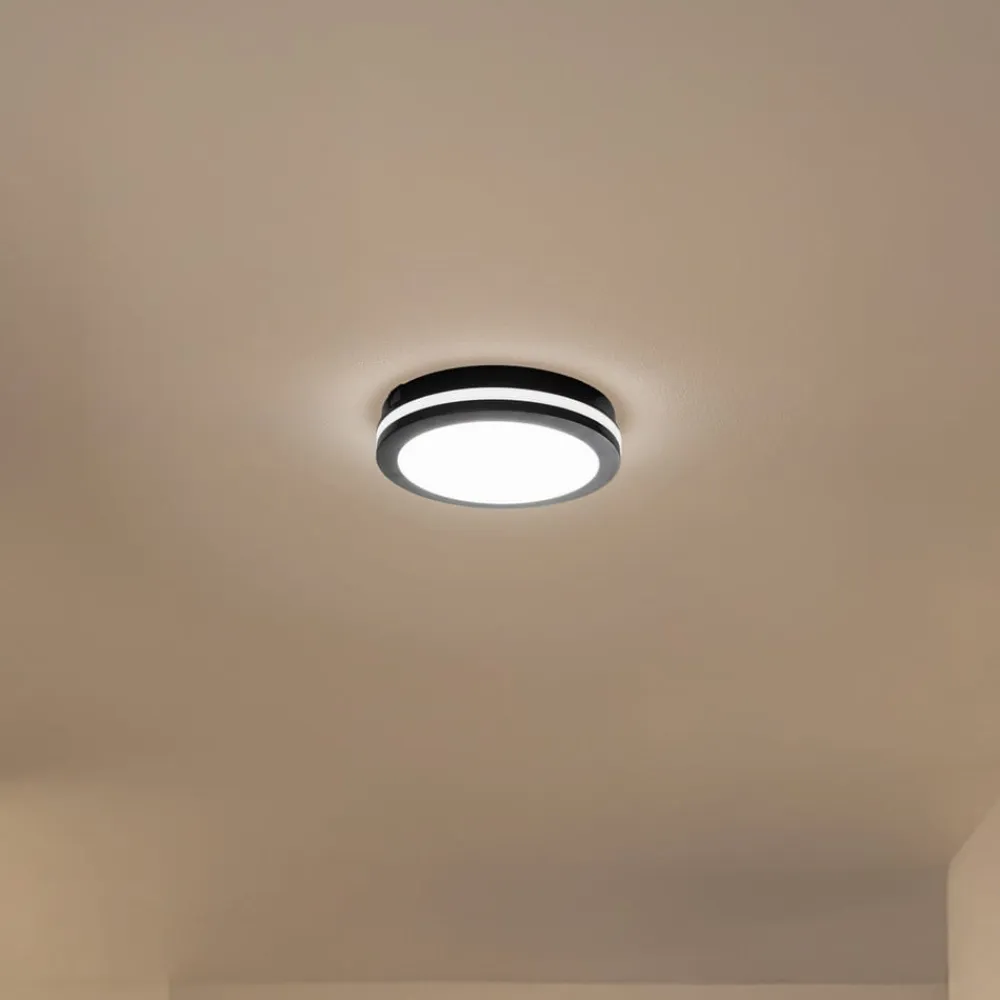 LED-loftlampen Marlon imponerer med sit moderne design og er fremstillet af polycarbonat. Med en kapslingsgrad på IP54 er den optimal til brug på altaner og terrasser, da den er pålideligt beskyttet mod stænkvand og støv. Den fast integrerede LED-lyskilde sikrer en jævn belysning og giver et energibesparende lys i universalhvid med 4.000 Kelvin, der skaber en behagelig og funktionel atmosfære. Den enkle farve i sort og hvid passer nemt ind i de fleste byggestilarter.