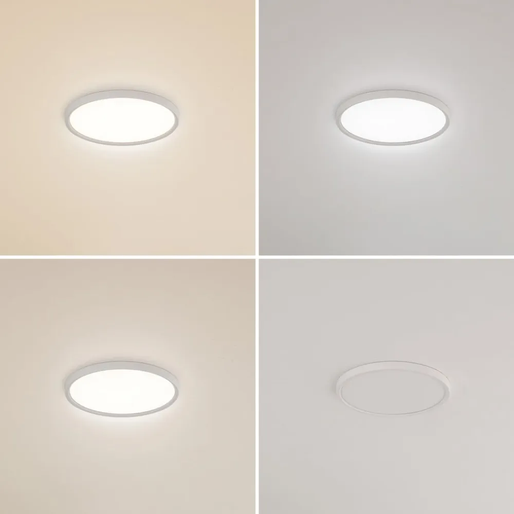 Pravin rund LED-loftlampe med tre forskellige hvide lysfarver Den runde LED-loftlampe Pravin er en allrounder til alle slags rum i hjemmet. Diskret i sit design, men med stor effekt. De tre lysfarver varmhvid (3.000 K), universalhvid (4.000 K) og dagslys (6.000 K) kan indstilles ved hjælp af lyskontakten. Det er denne funktionalitet, der gør dem så alsidige: varmere lys til hyggelige områder i huset, køligere lys til arbejdsområder – uanset om det er i arbejdsværelset eller i værkstedet i kælderen.
